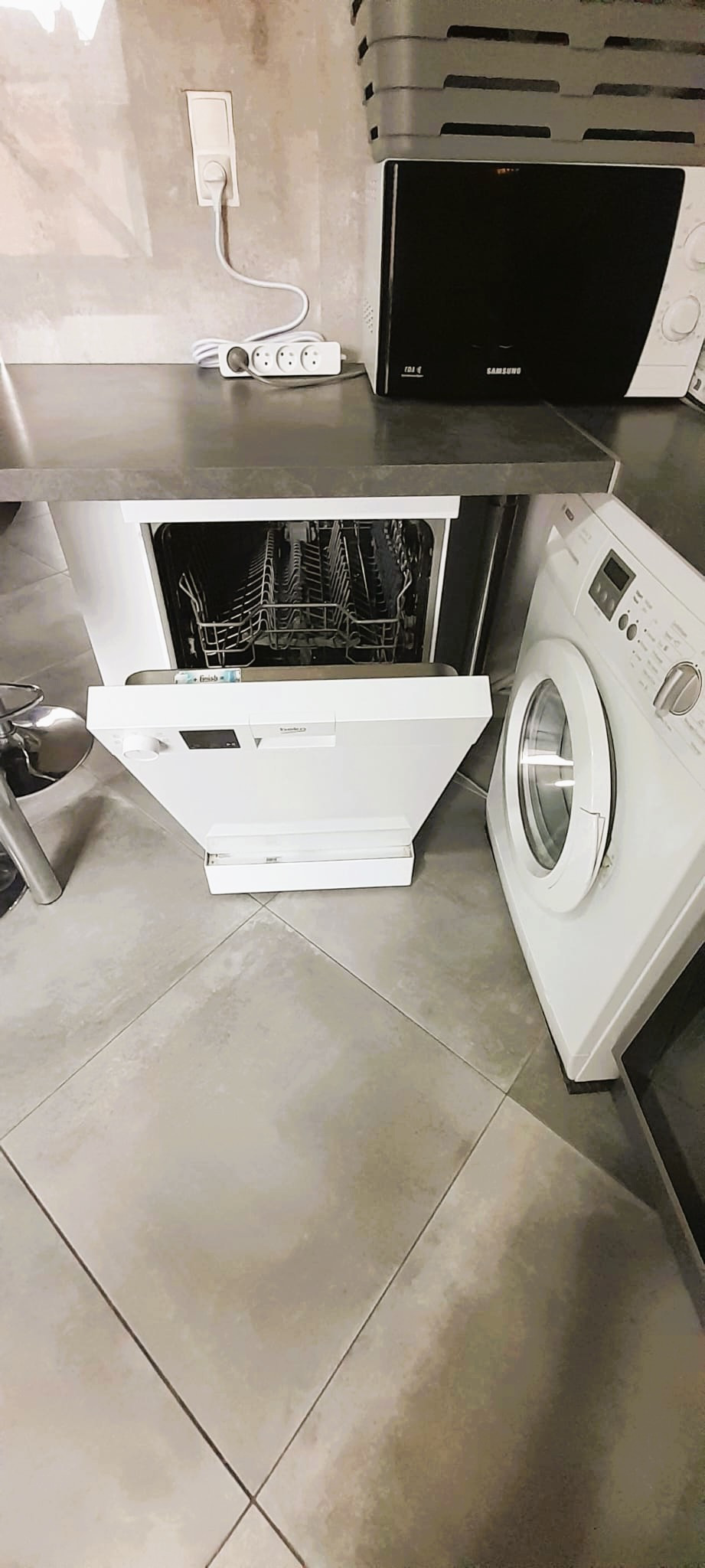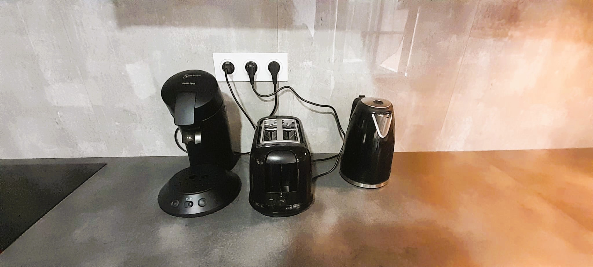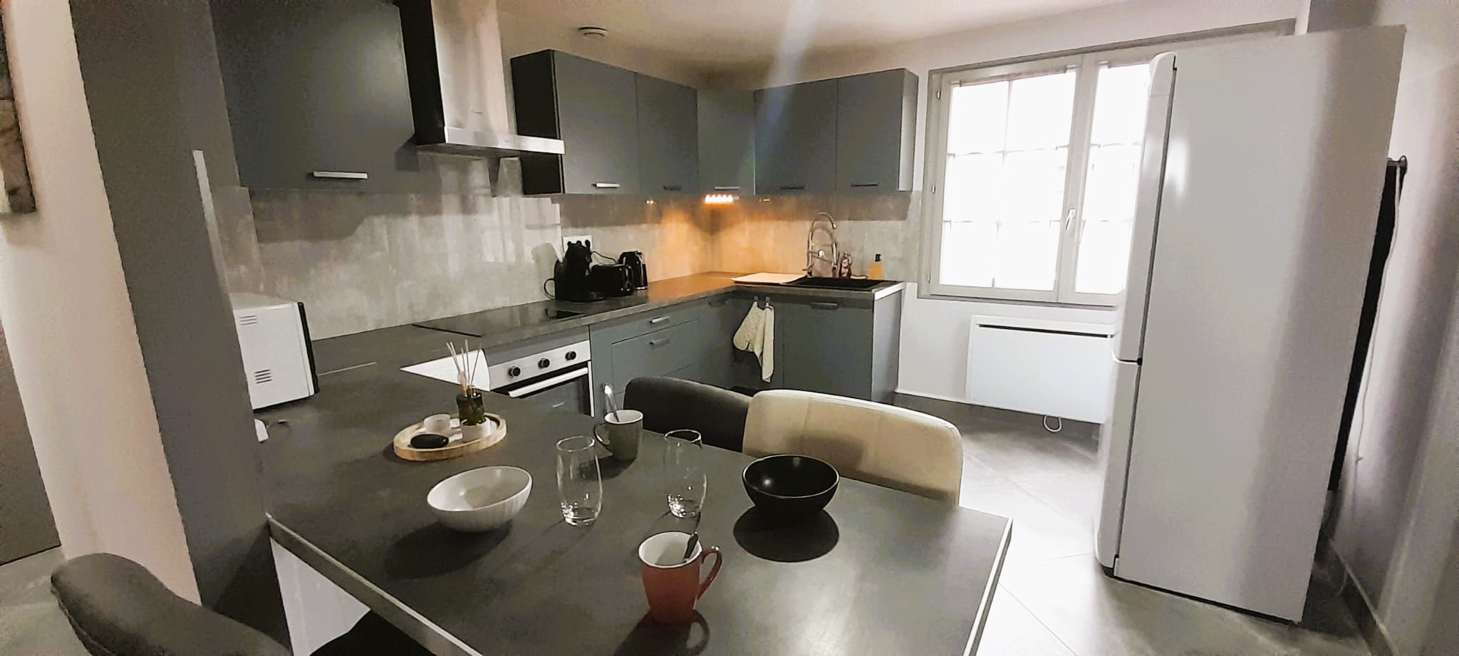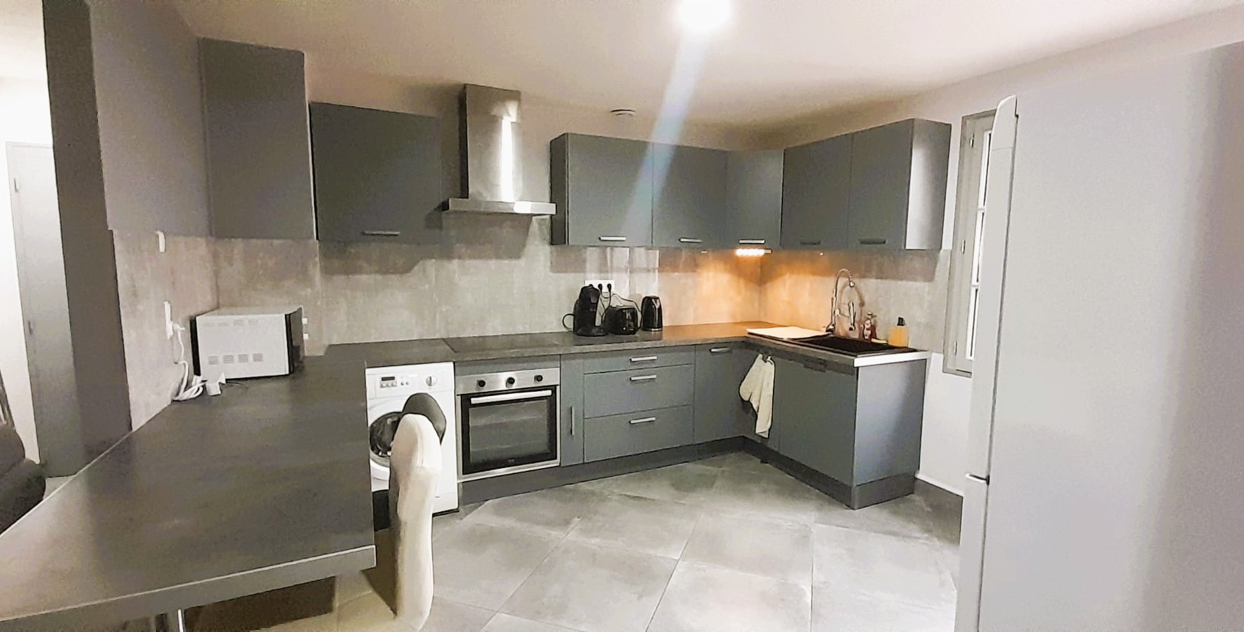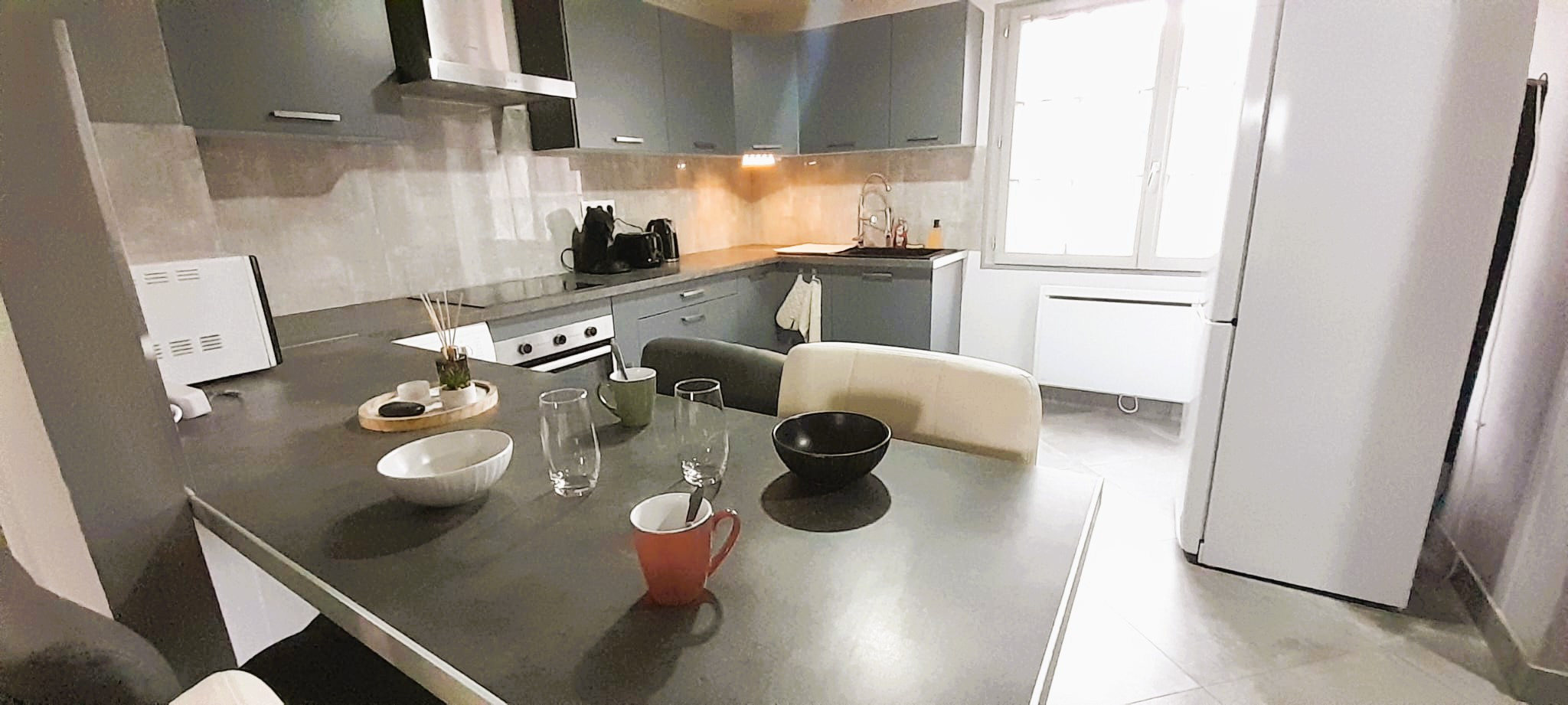 La cuisine américaine entièrement équipée ravira les amateurs de cuisine. Elle dispose de tous les équipements essentiels : réfrigérateur, congélateur, lave-vaisselle, four, plaque vitrocéramique, machine à café, bouilloire, grille-pain et une collection complète de vaisselle et ustensiles de cuisine.
