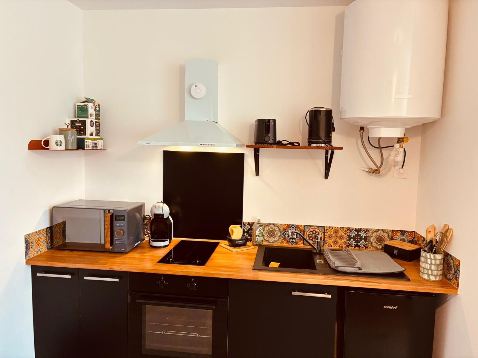 Ce logement moderne et élégamment meublé offre un espace de vie optimisé avec une cuisine américaine entièrement équipée. Vous y trouverez tous les équipements essentiels : plaque vitrocéramique, réfrigérateur, four, micro-ondes, machine à café dolce gusto, bouilloire, vaisselle et ustensiles de cuisine. Un toast rapide ou un café sera un jeu d'enfant !