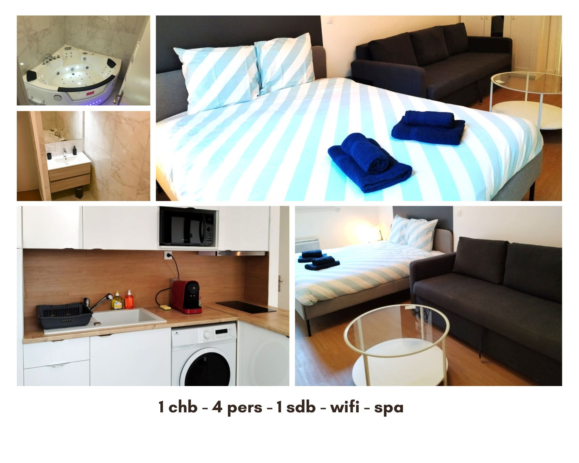 L'appartement dispose d'une chambre avec un lit double et d'un canapé-lit double, permettant d'accueillir jusqu'à 4 personnes. La salle de bain comprend une baignoire balnéo. Vous apprécierez les équipements modernes tels que la machine à laver, le lave-vaisselle, le micro-ondes et la cafetière.