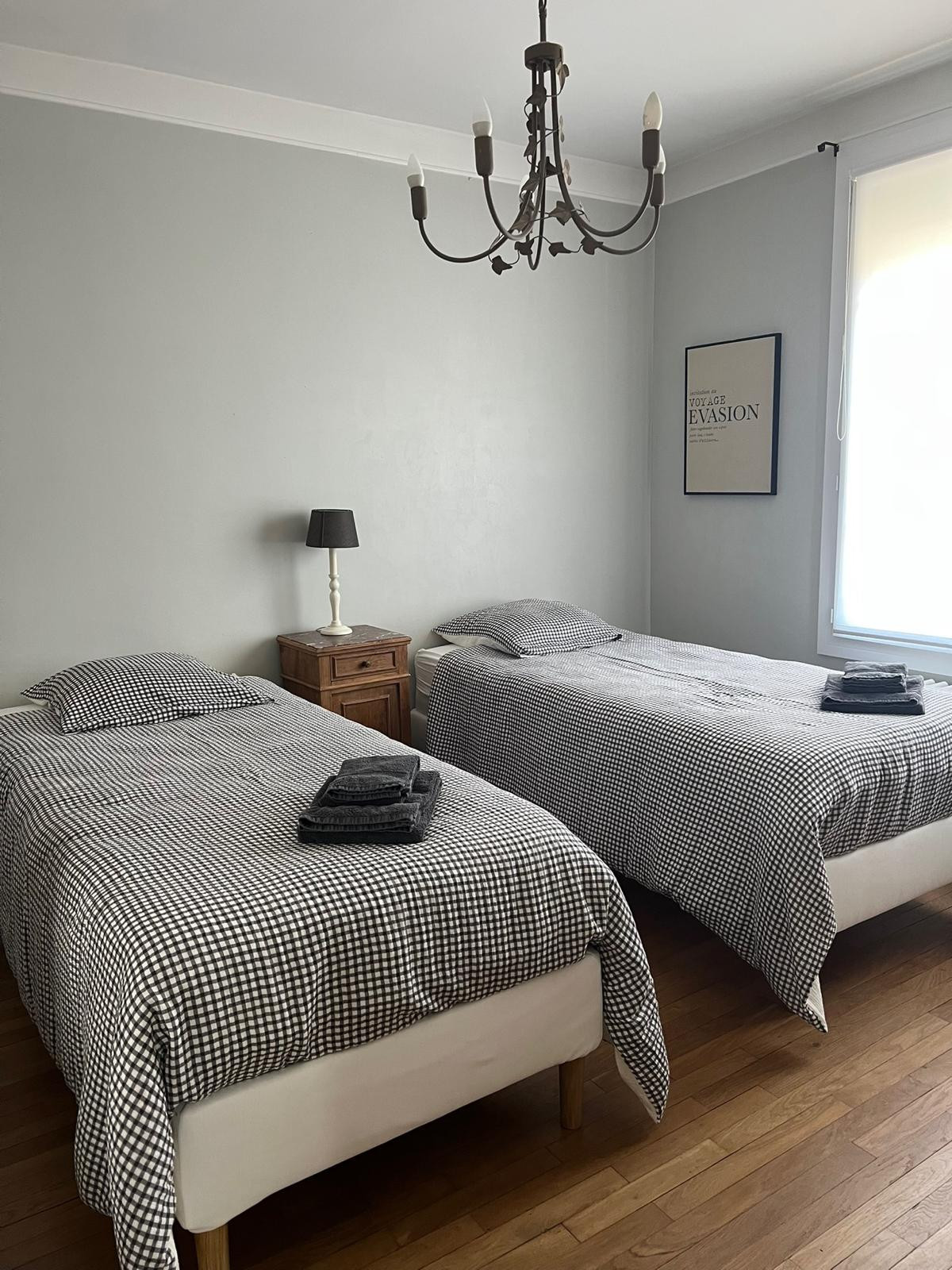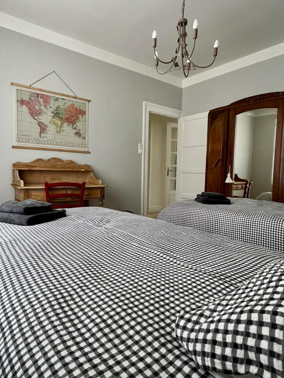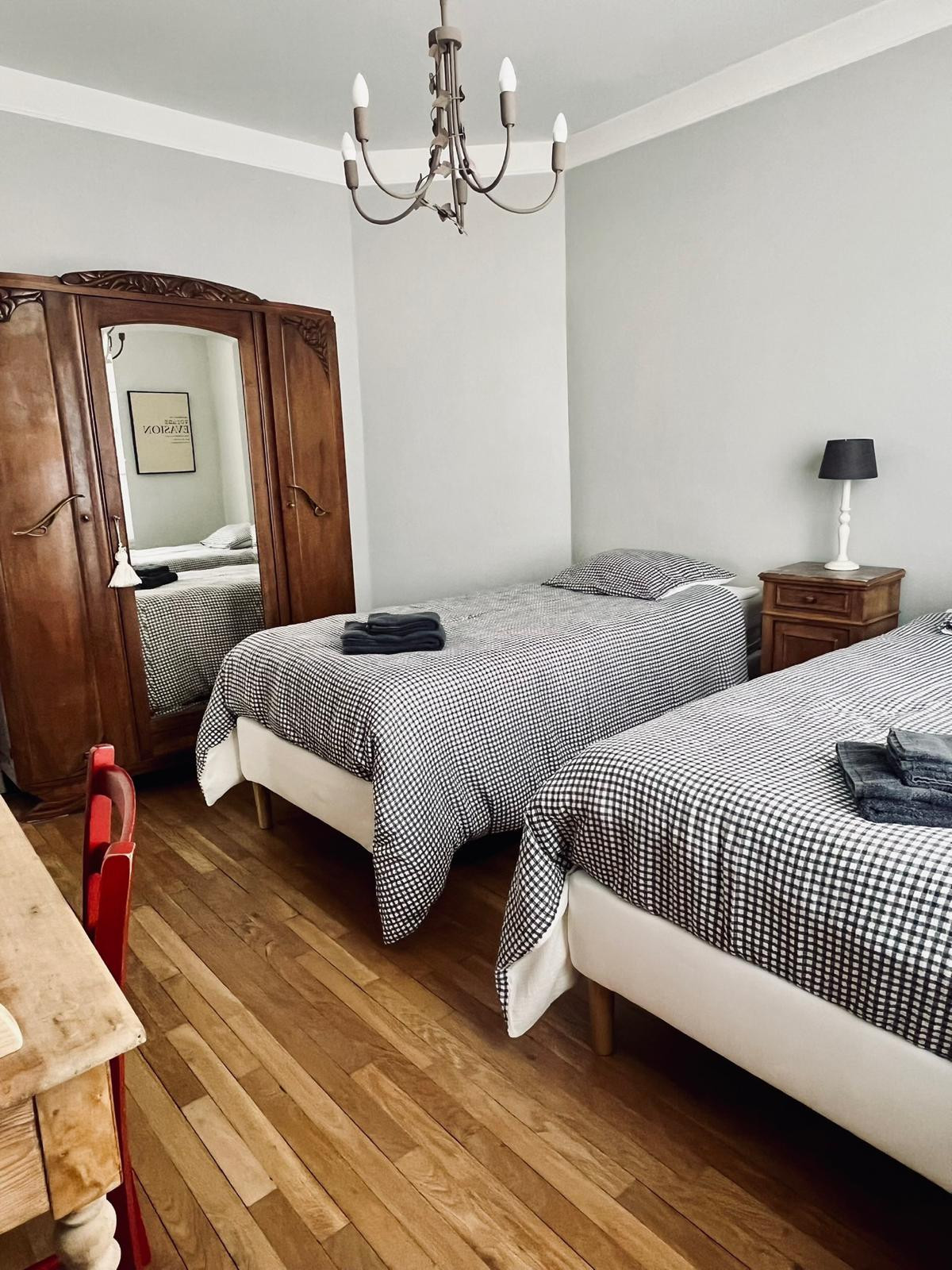 Elle offre deux chambres chaleureuses : l'une avec un lit queen size, l'autre avec deux lits simples, parfaite pour accueillir enfants, amis ou collègues. Vous y trouverez aussi un salon cosy pour vous détendre, une cuisine entièrement équipée pour cuisiner comme à la maison, et une salle de bain fonctionnelle avec une douche moderne.