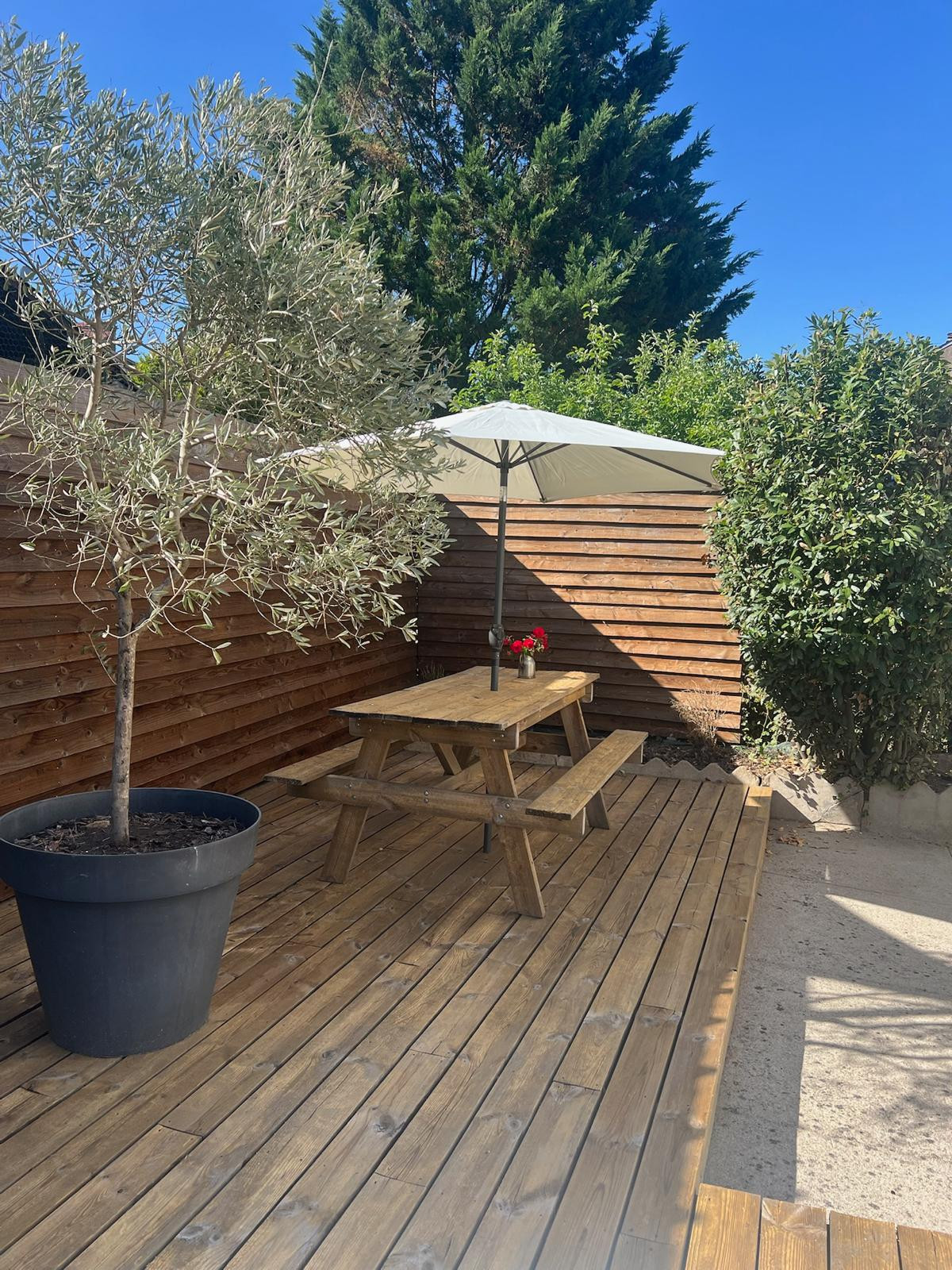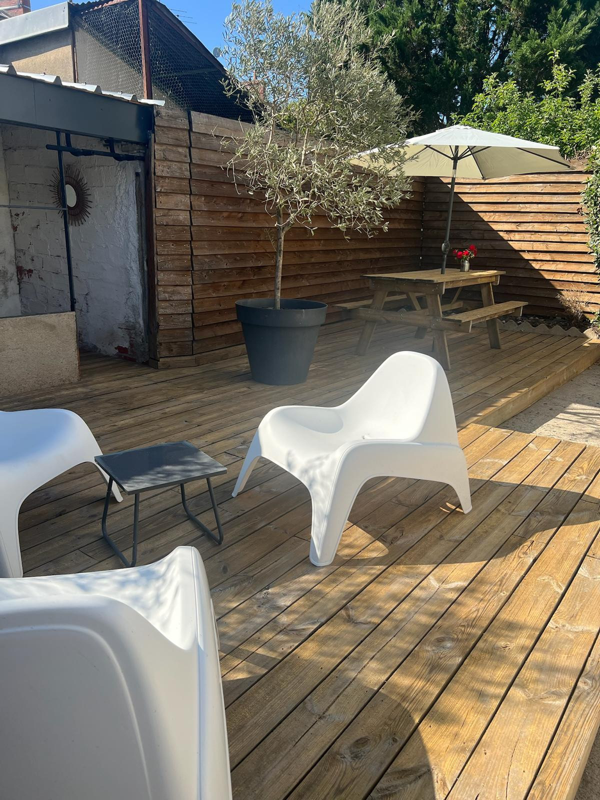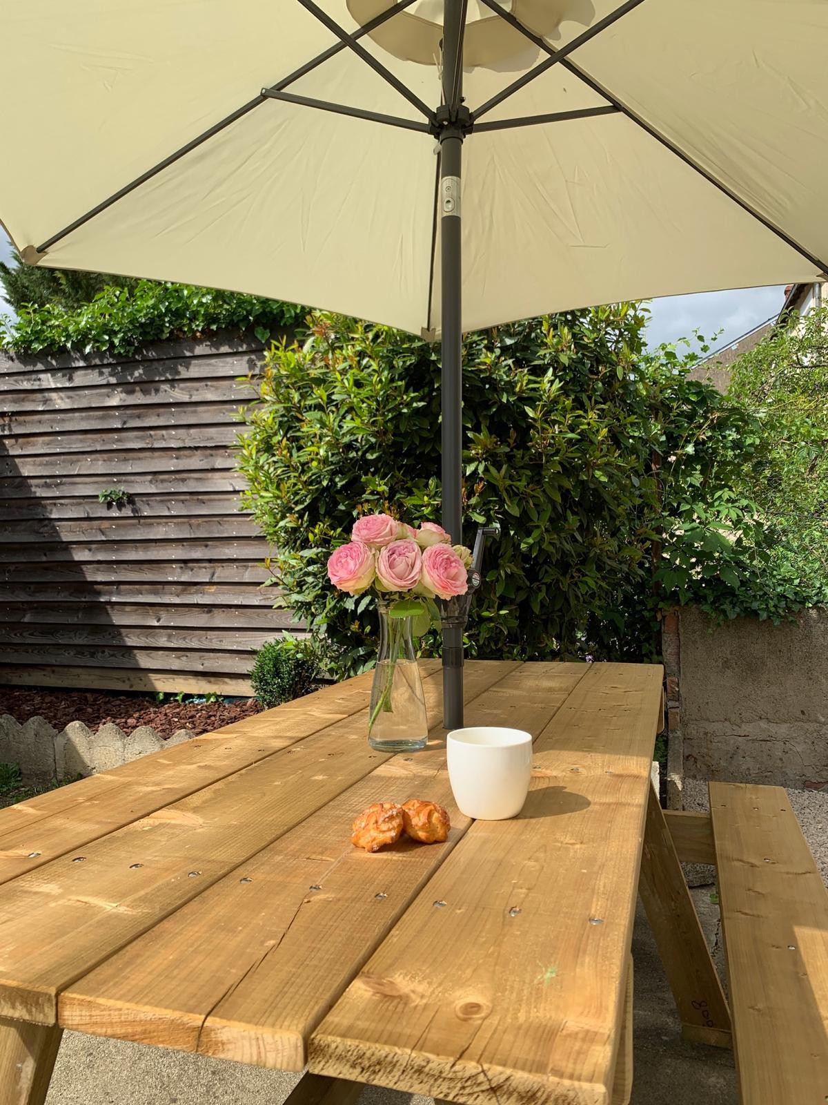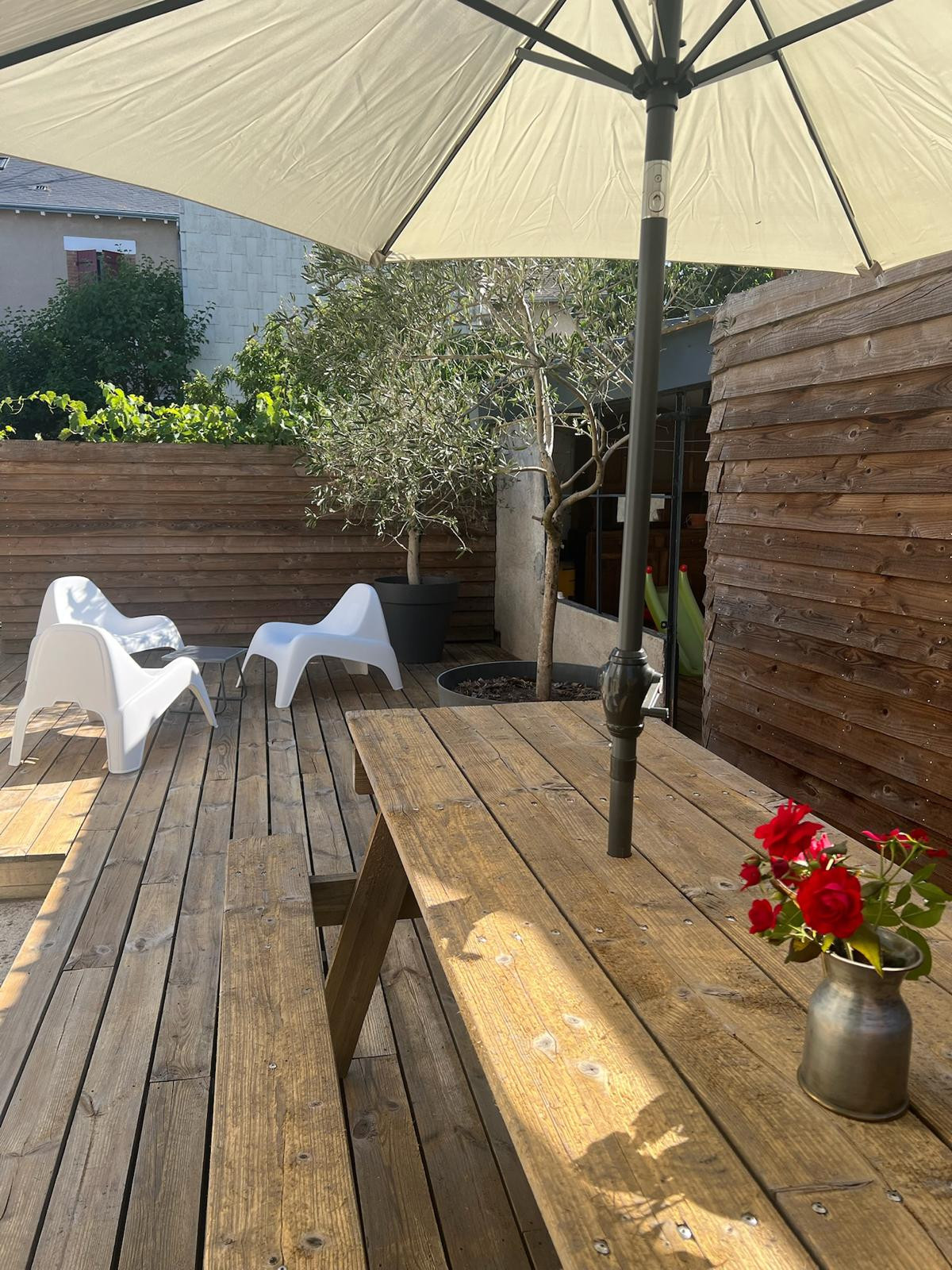 Le vrai petit bonheur, c’est la cour privée, intime, avec mobilier de jardin et une jolie terrasse où il fait bon prendre un café au soleil ou dîner à la belle étoile.
