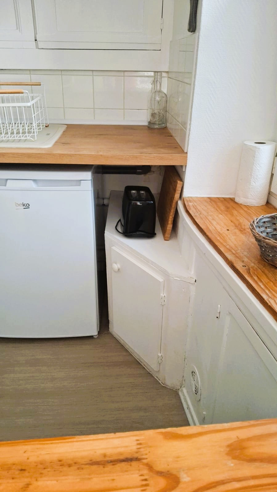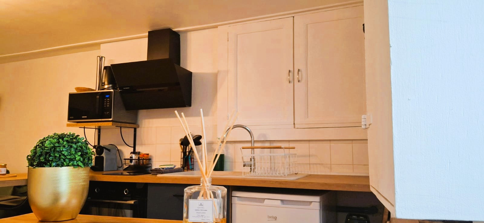 La cuisine américaine est entièrement équipée et moderne, comprenant une plaque vitrocéramique, un réfrigérateur, un congélateur, un four, un micro-ondes, une machine à café, un grille-pain, une bouilloire et tous les ustensiles nécessaires pour préparer de délicieux repas.