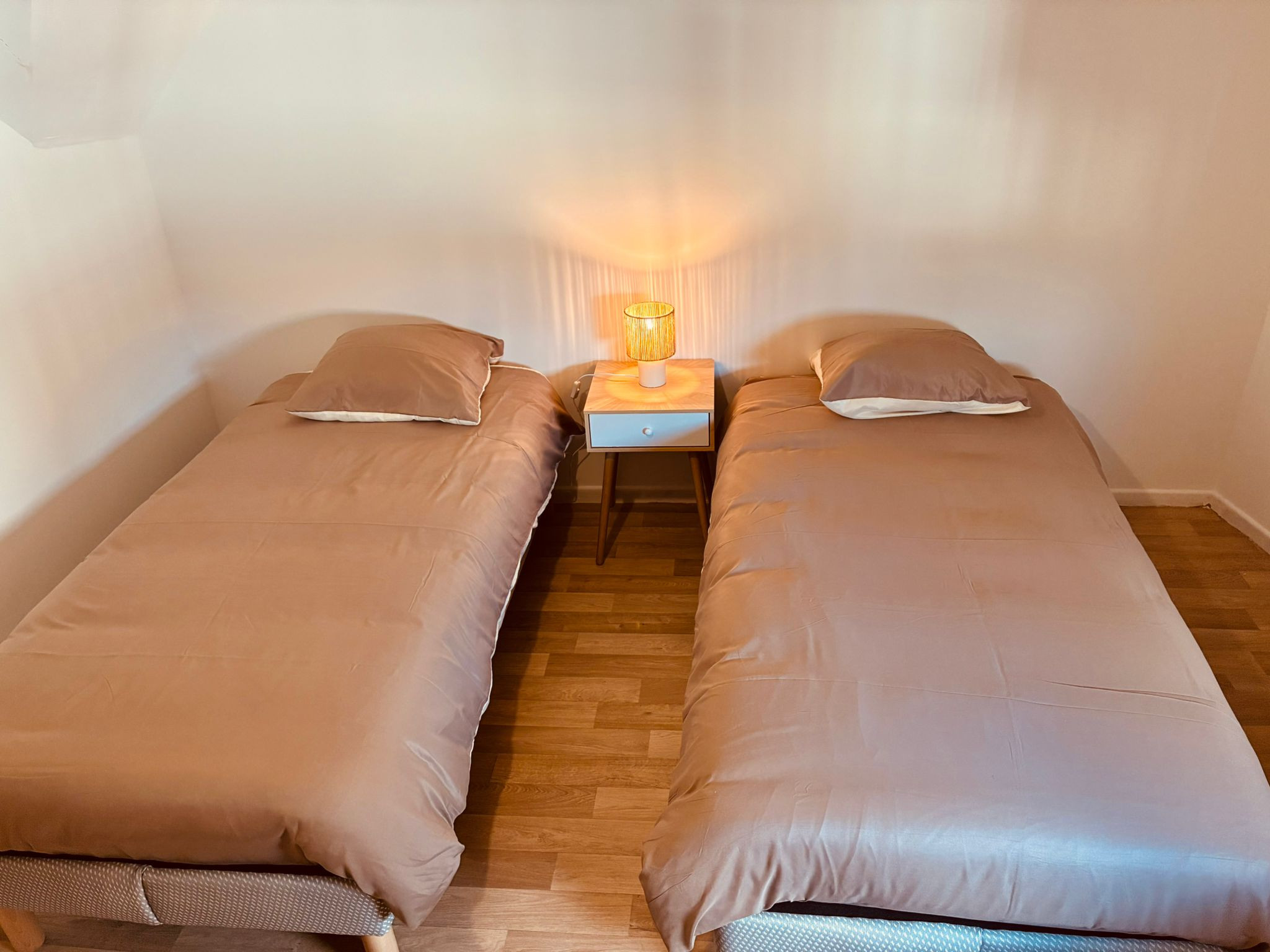 Cette maison offre un espace de vie agréable accueillant jusqu'à 6 personnes. Les deux chambres disposent chacune de 2 lits simples, modulables en lits king-size selon la composition de votre groupe. Un canapé-lit supplémentaire permet d'augmenter la capacité d'accueil.