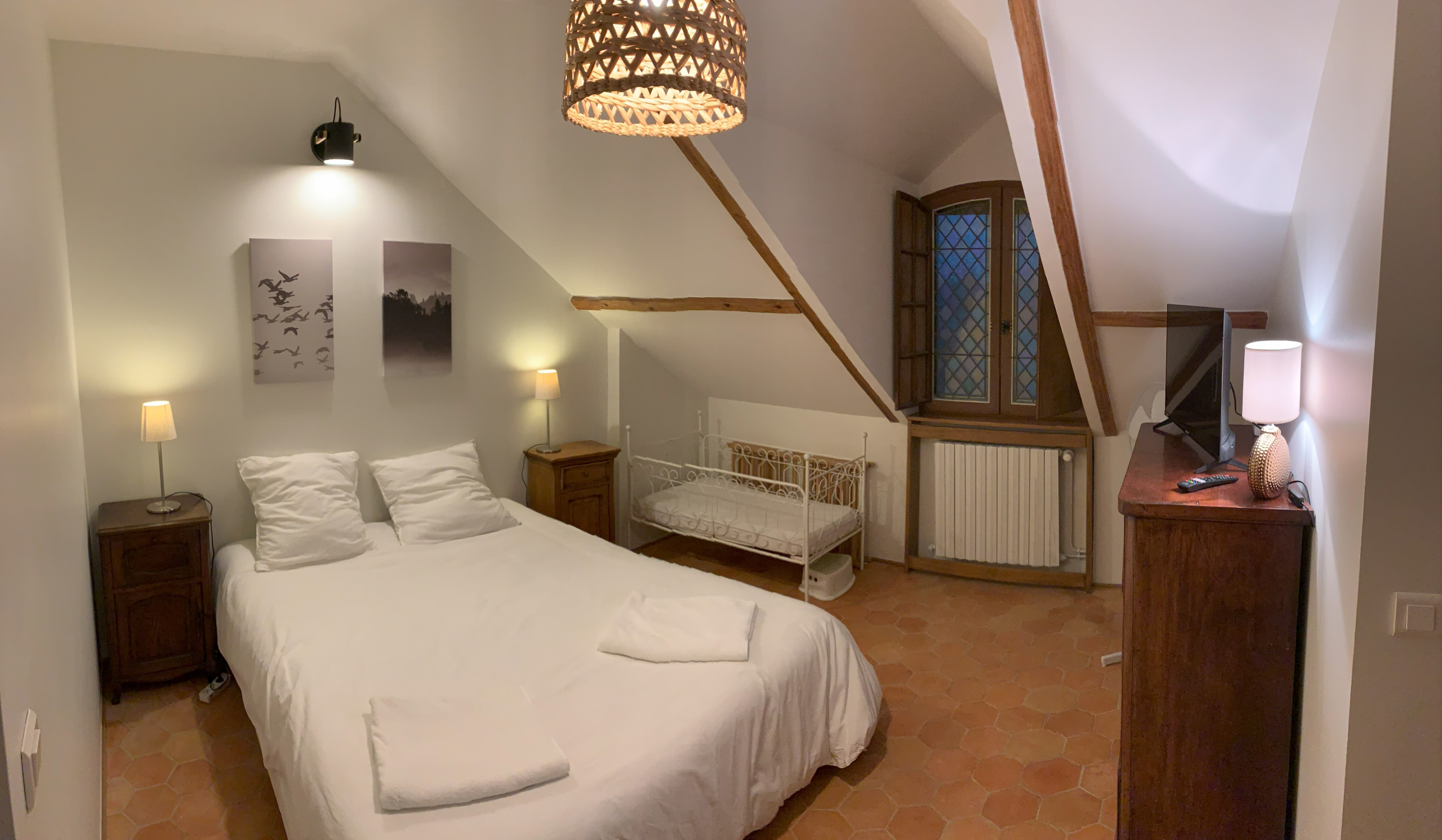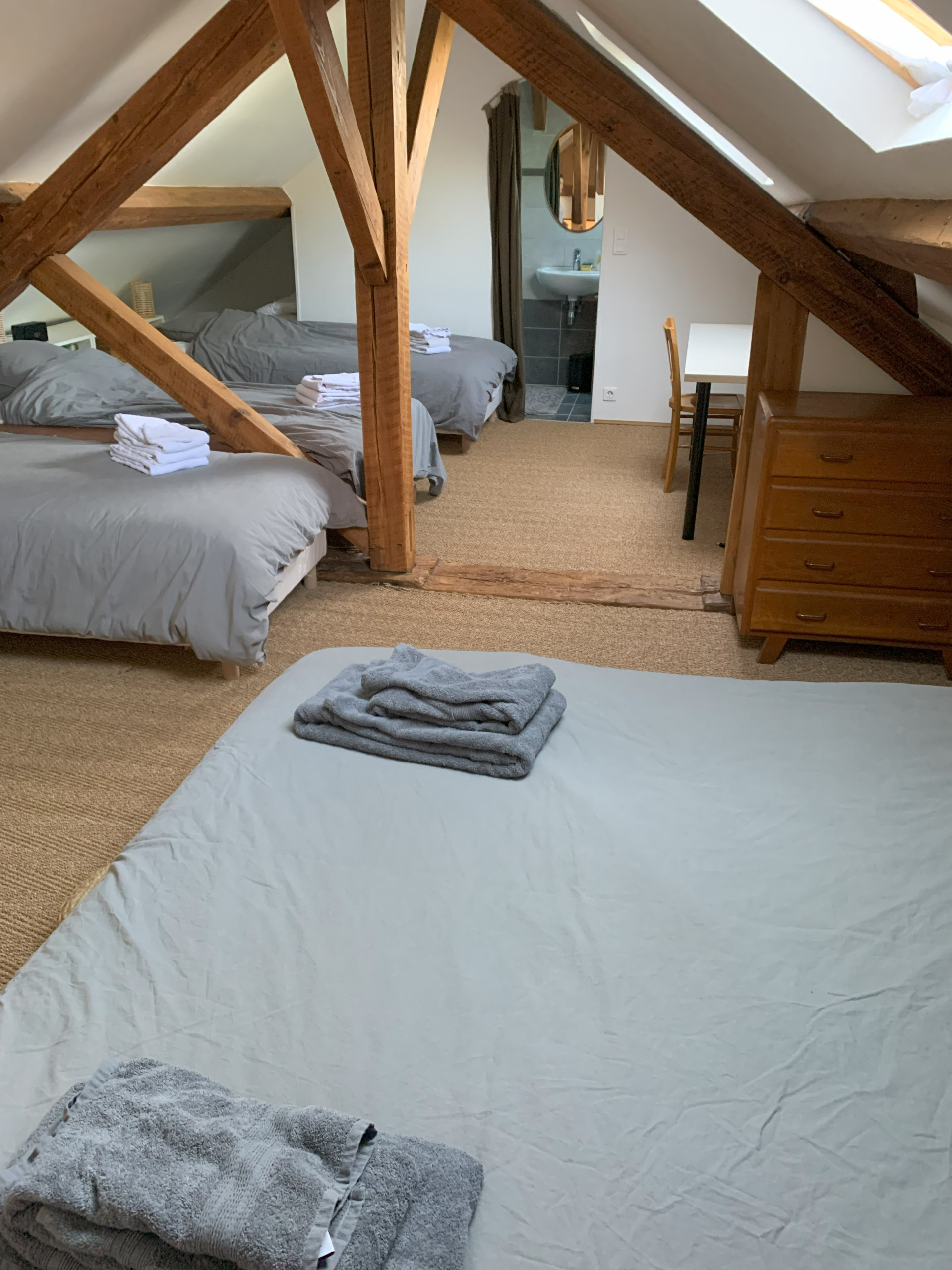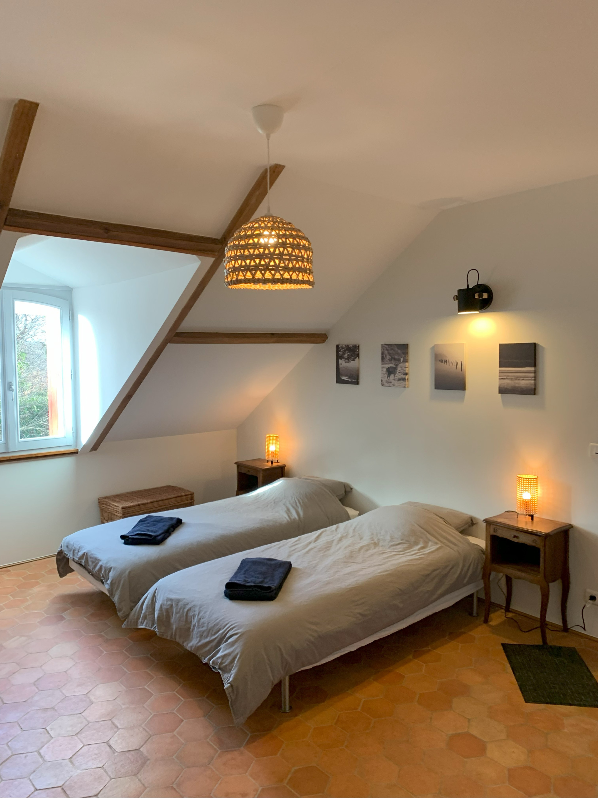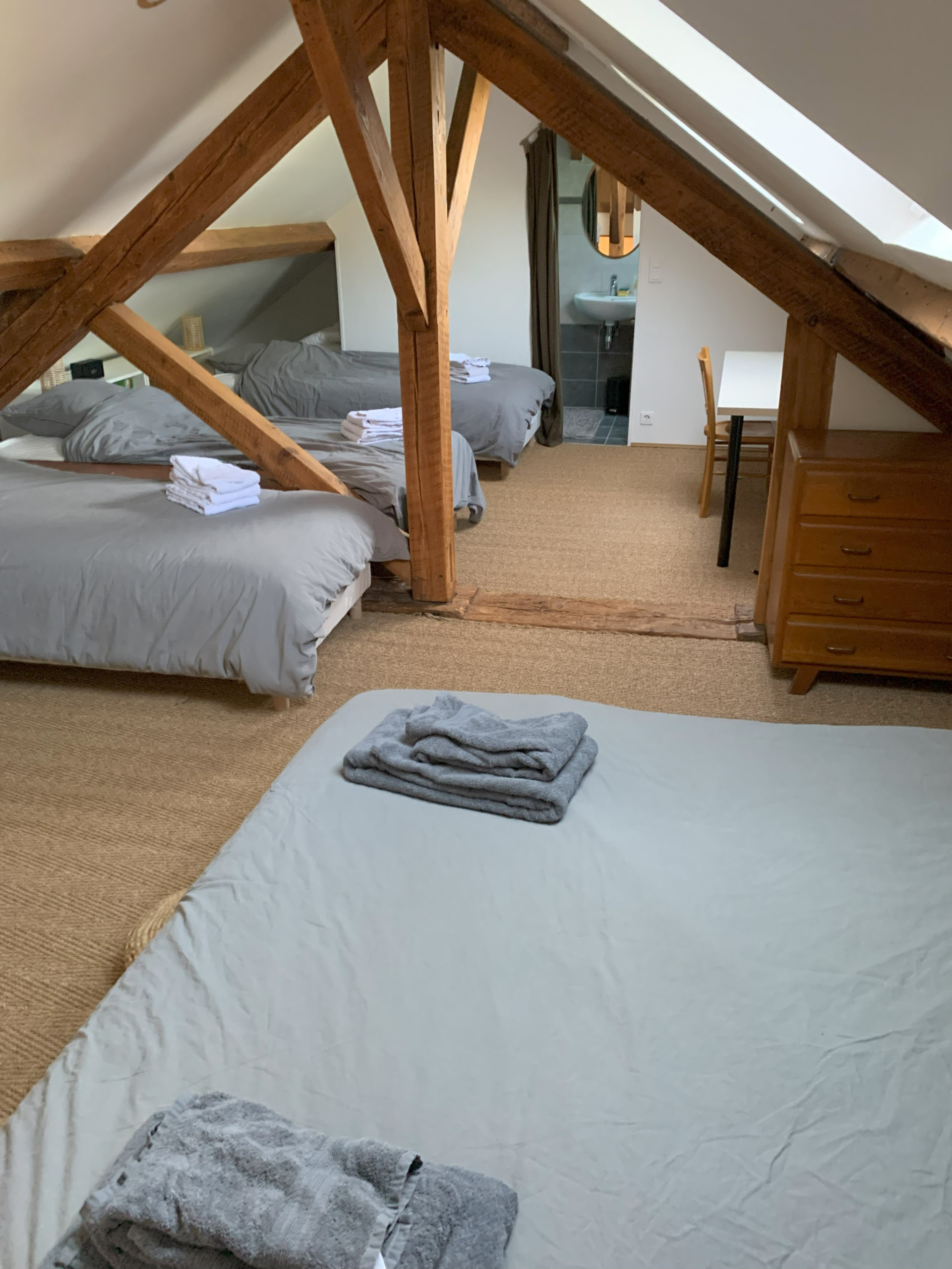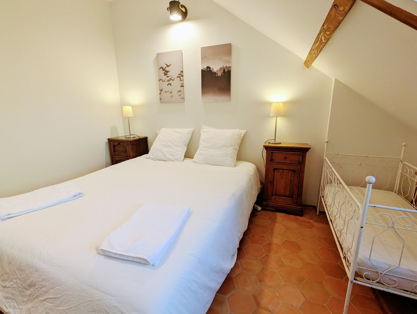 Accessible par un escalier extérieur : chambre avec lit 2 personnes (160 x 200 cm) et deux lits une personne (80 x 190 cm) pouvant être rapprochés pour former un lit 2 personnes grâce à un surmatelas, wc séparés et salle d'eau.
