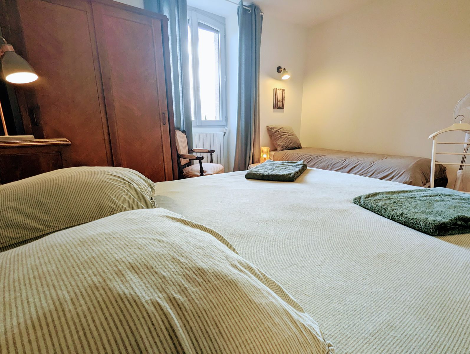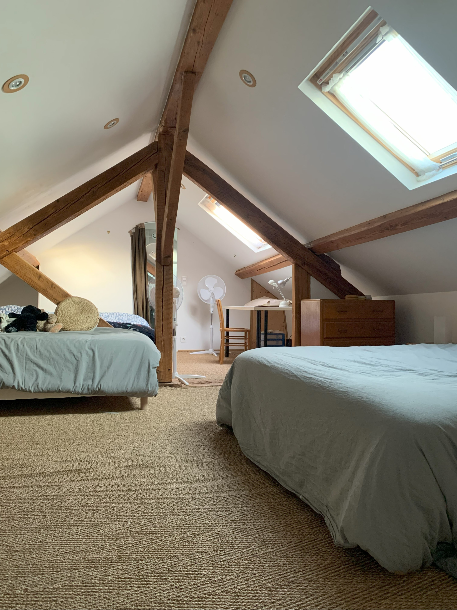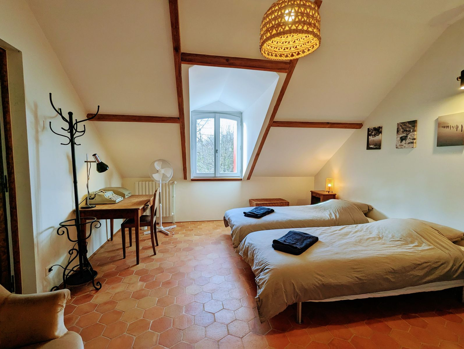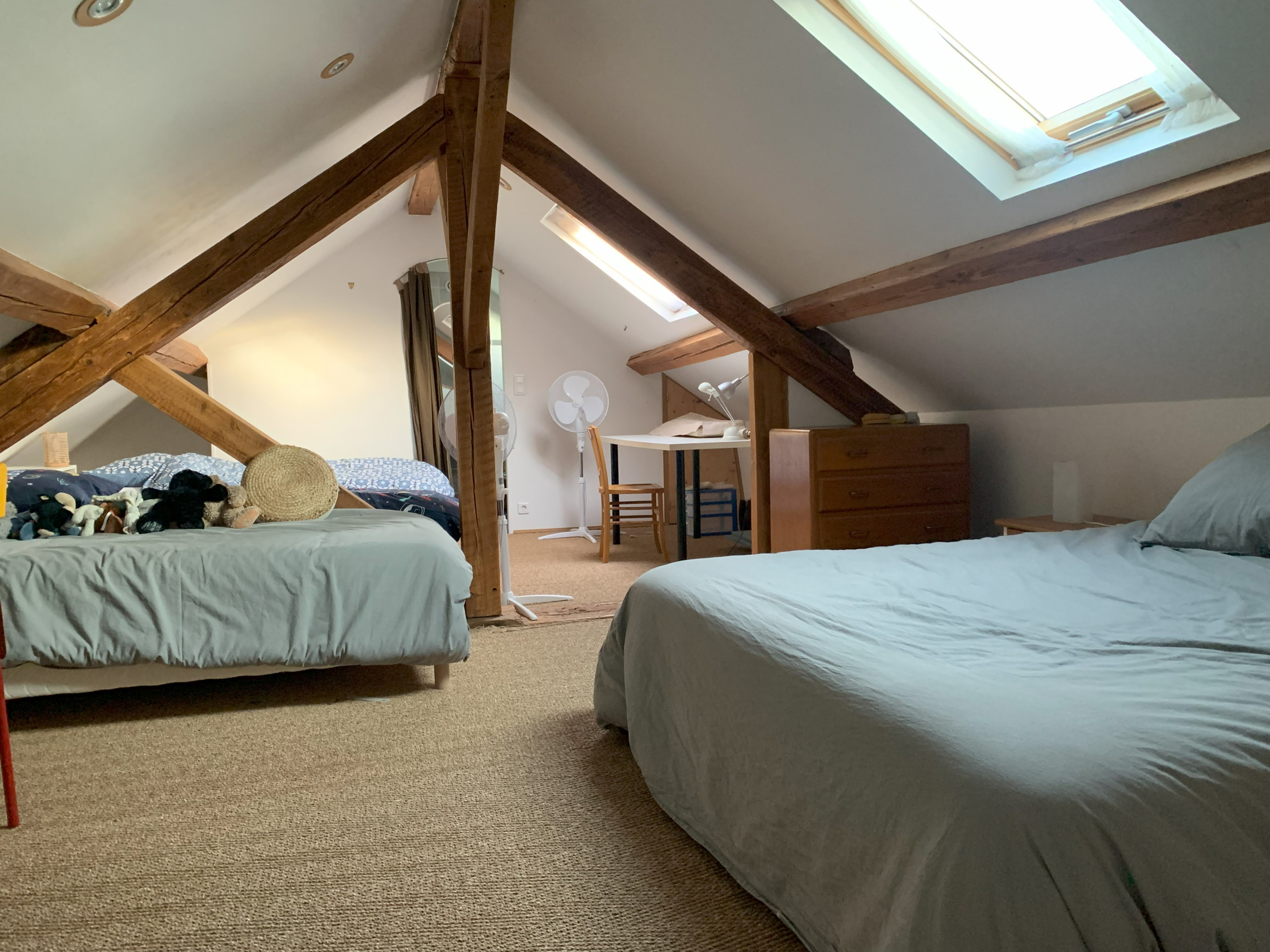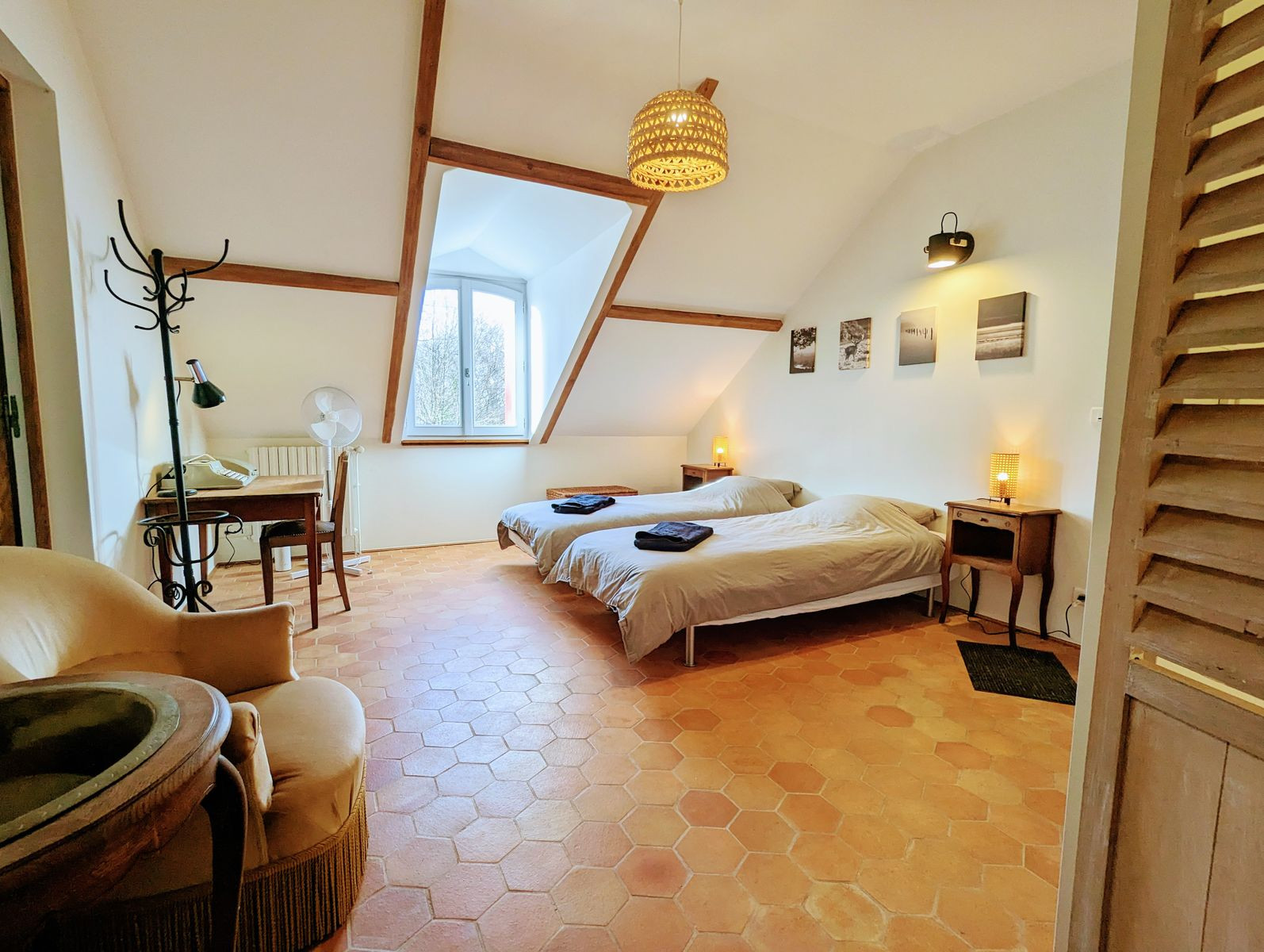 Accessible par un escalier extérieur : chambre avec lit 2 personnes (160 x 200 cm) et deux lits une personne (80 x 190 cm) pouvant être rapprochés pour former un lit 2 personnes grâce à un surmatelas, wc séparés et salle d'eau.