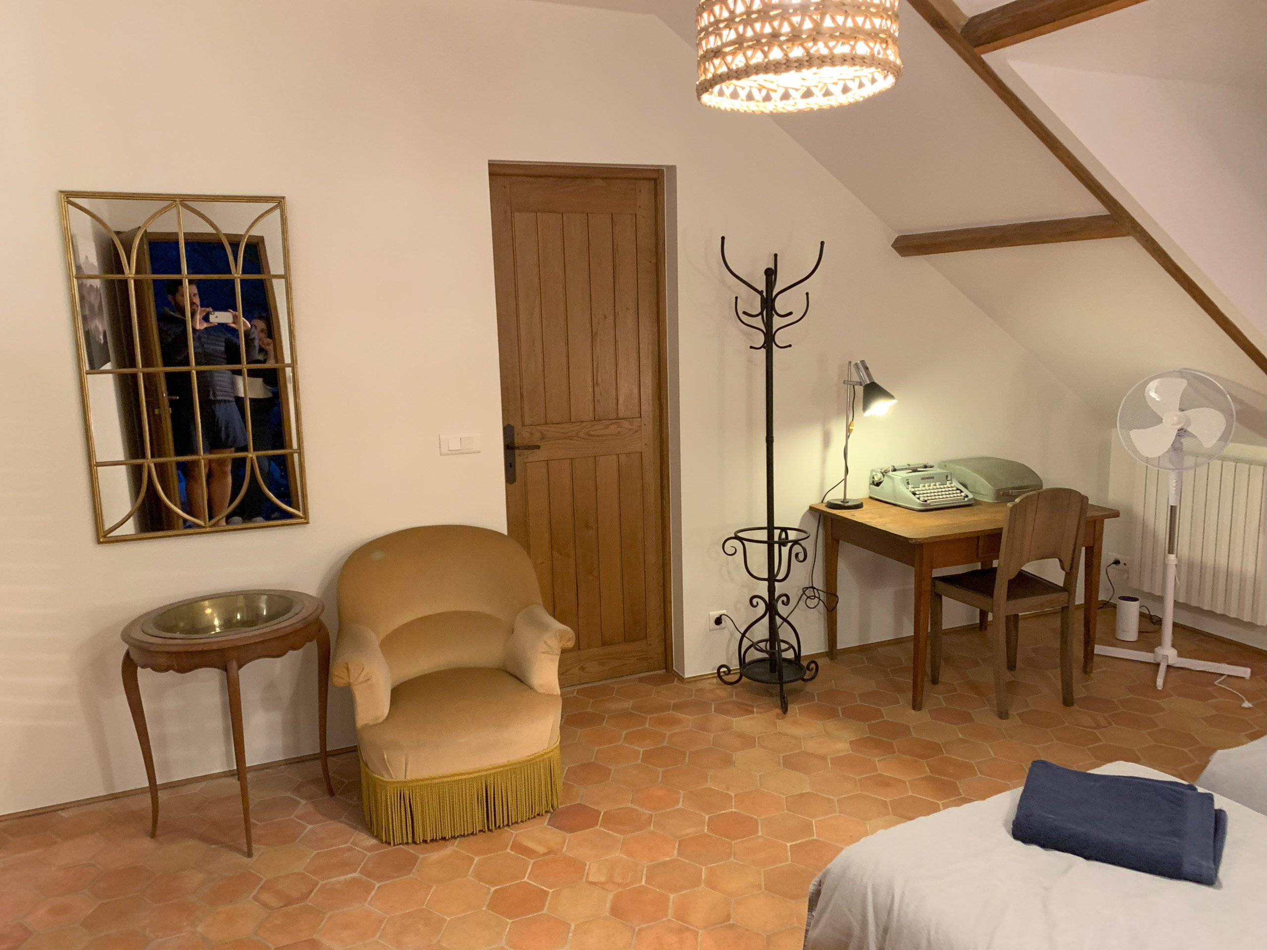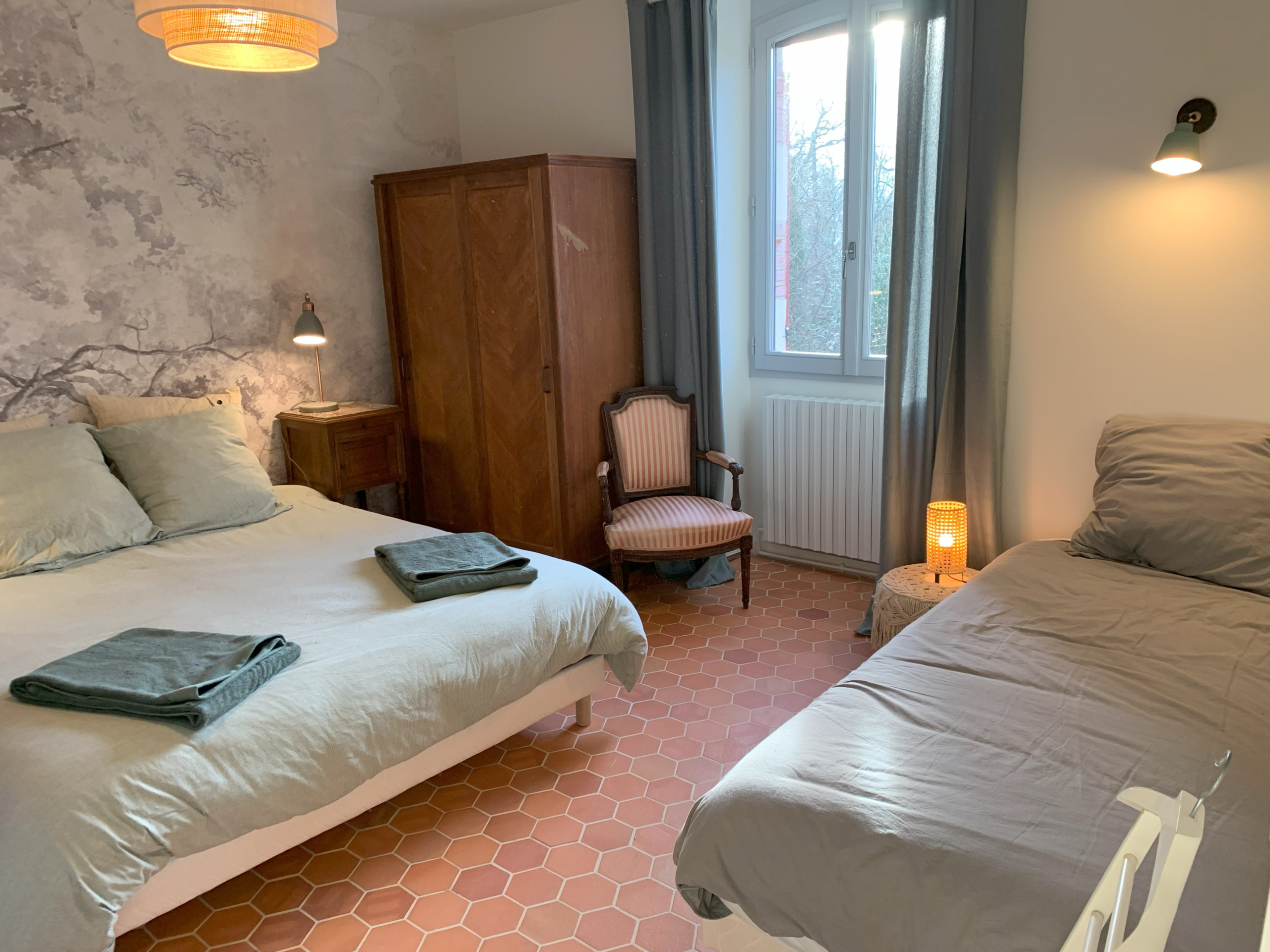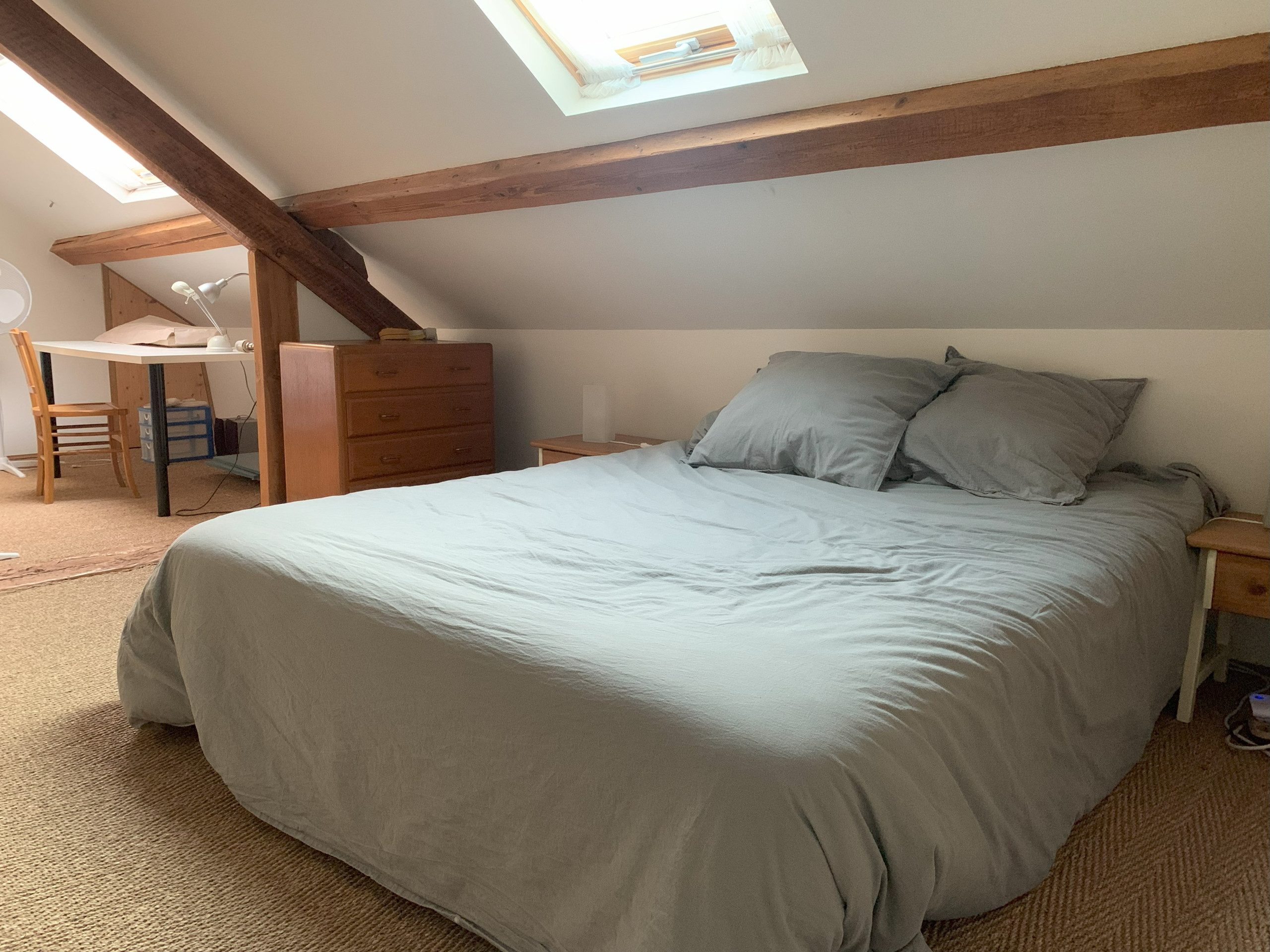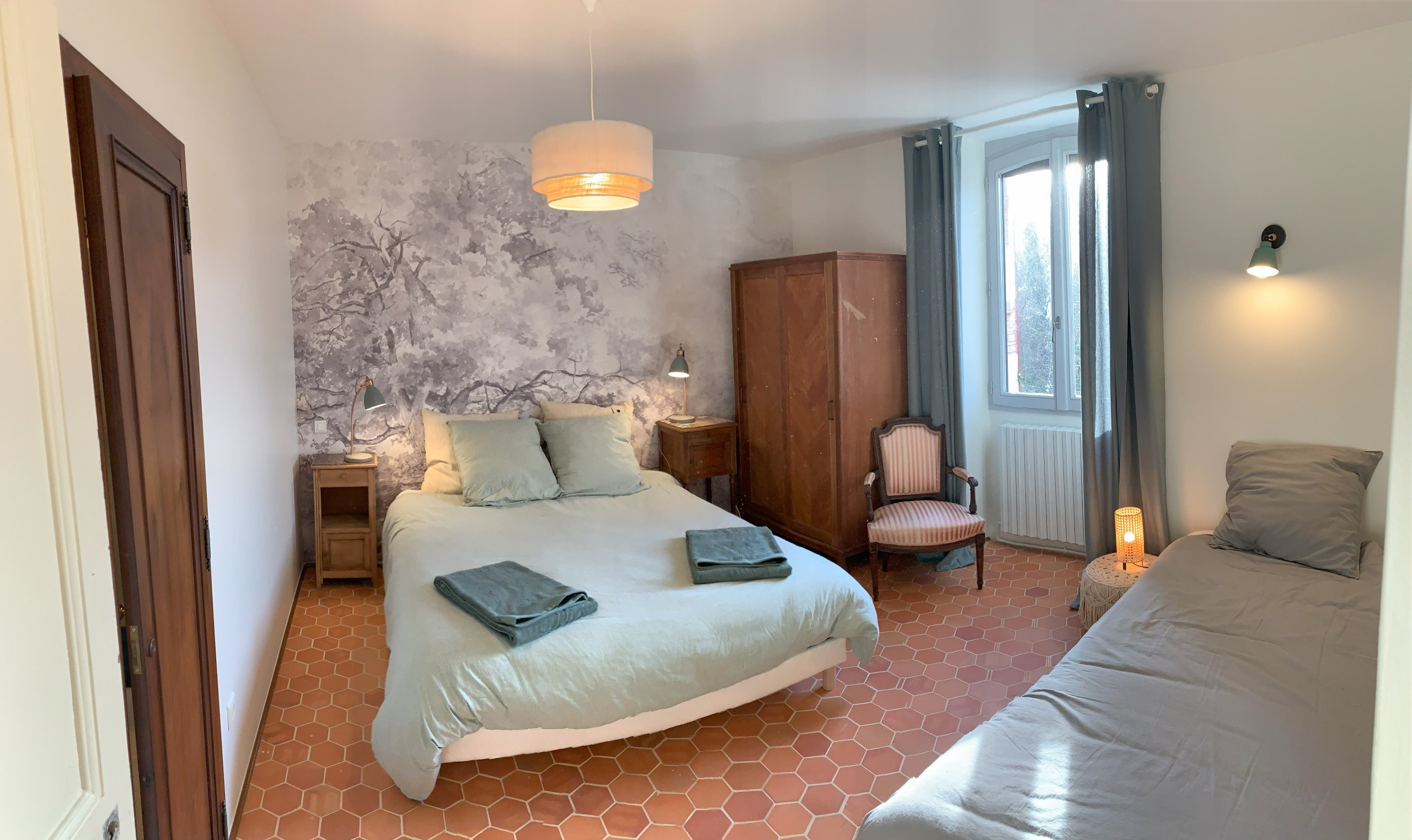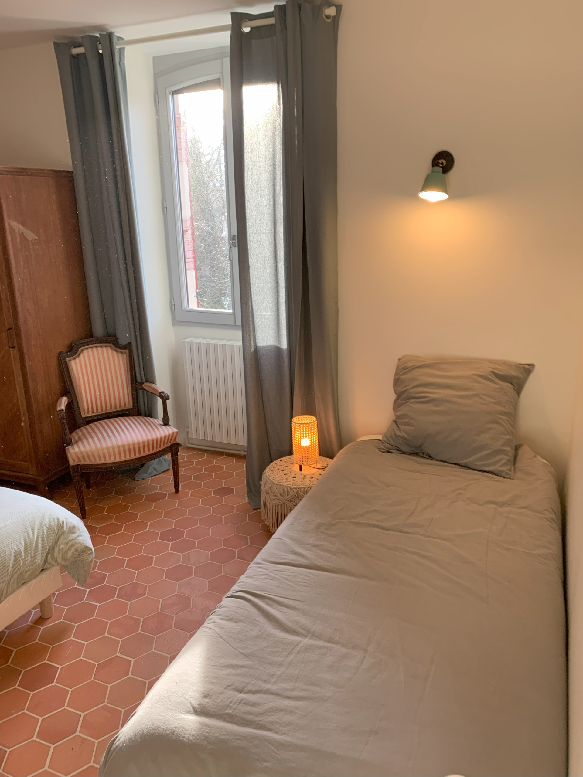 Accessible par un escalier extérieur : chambre avec lit 2 personnes (160 x 200 cm) et deux lits une personne (80 x 190 cm) pouvant être rapprochés pour former un lit 2 personnes grâce à un surmatelas, wc séparés et salle d'eau.