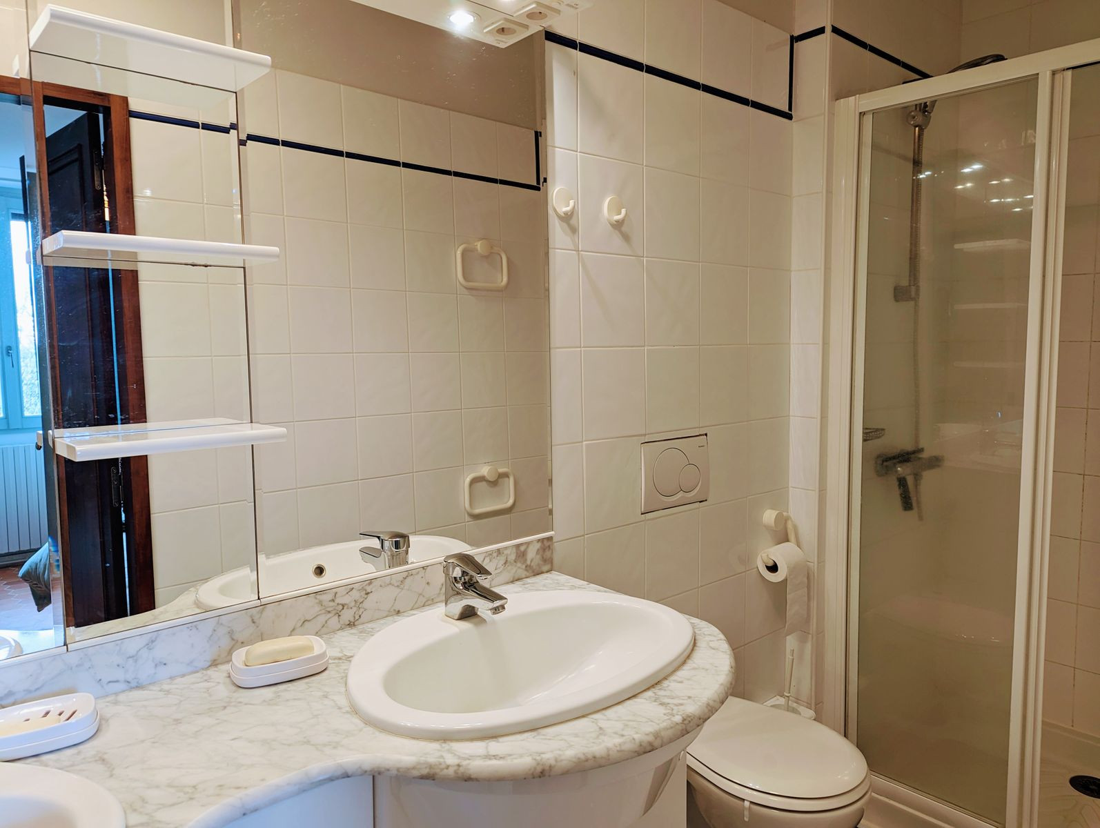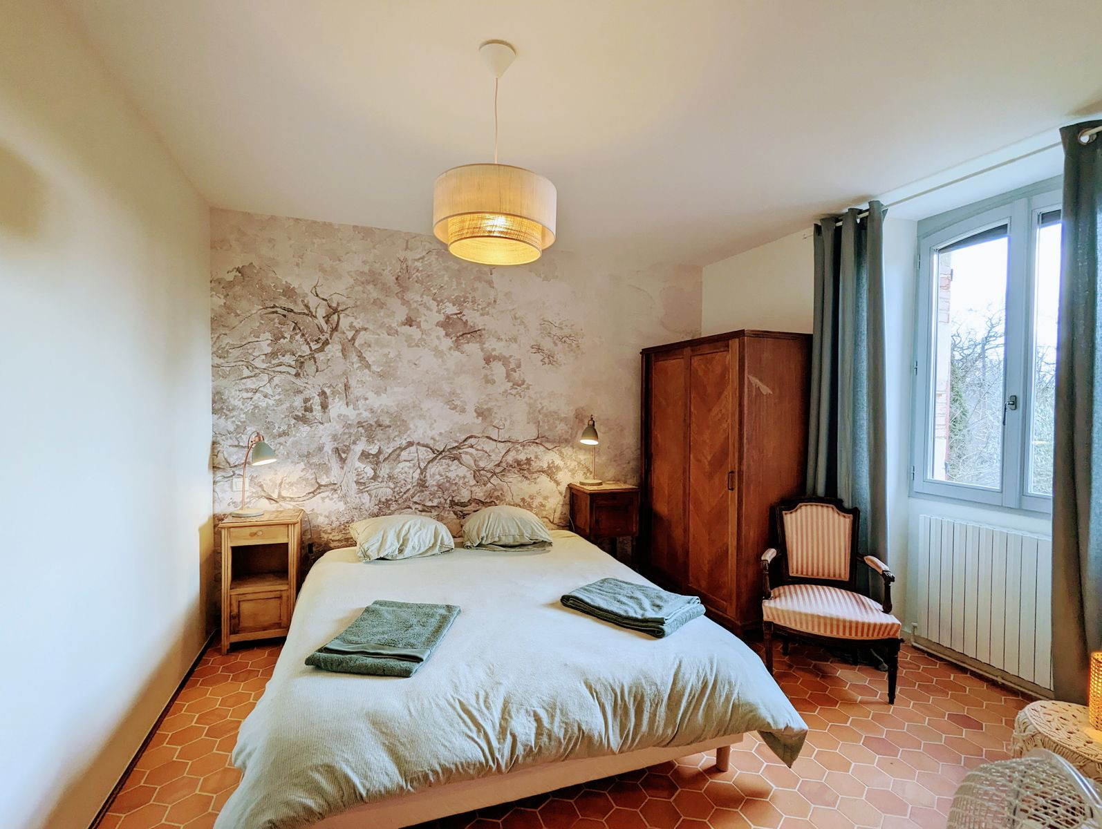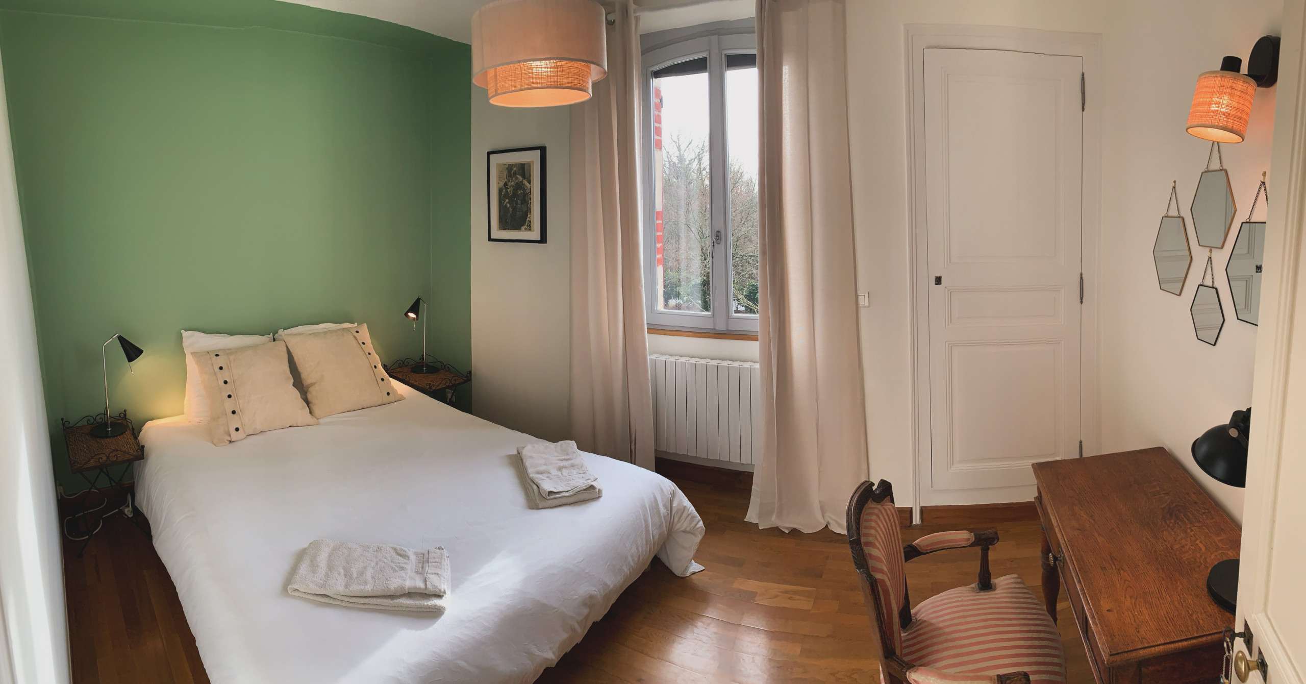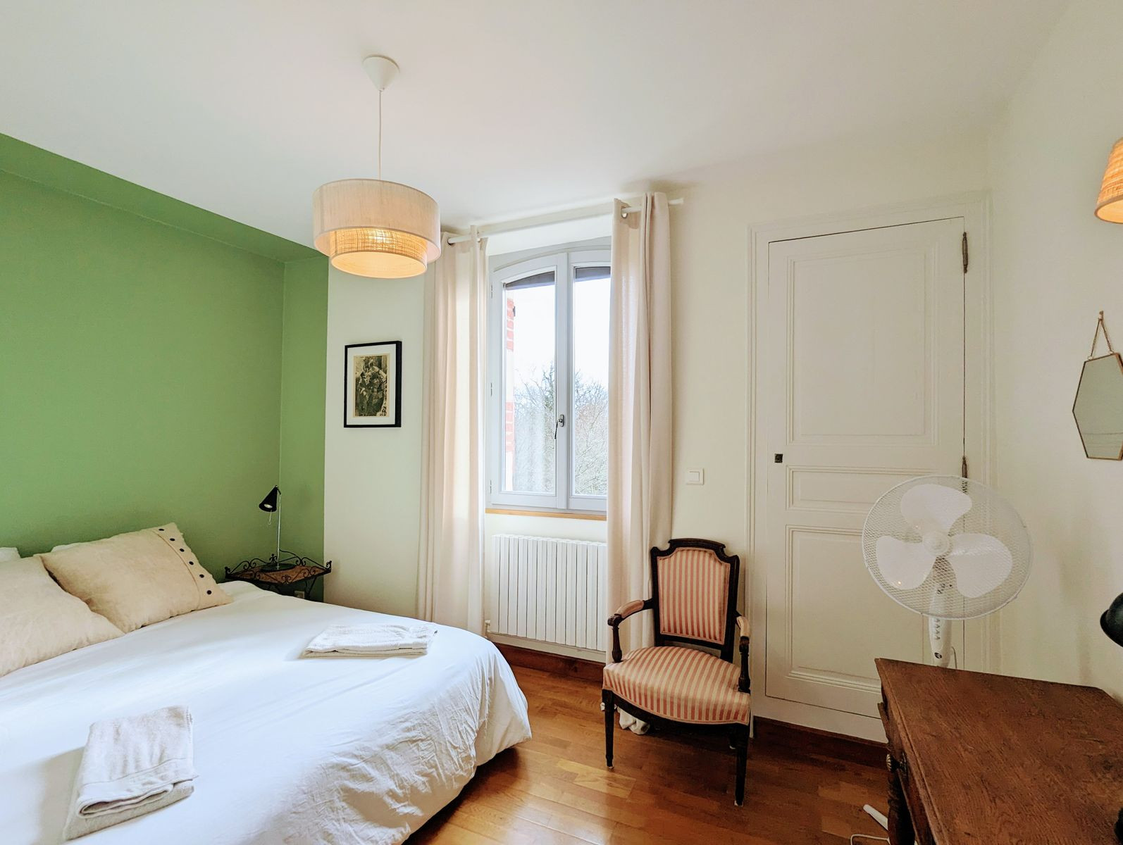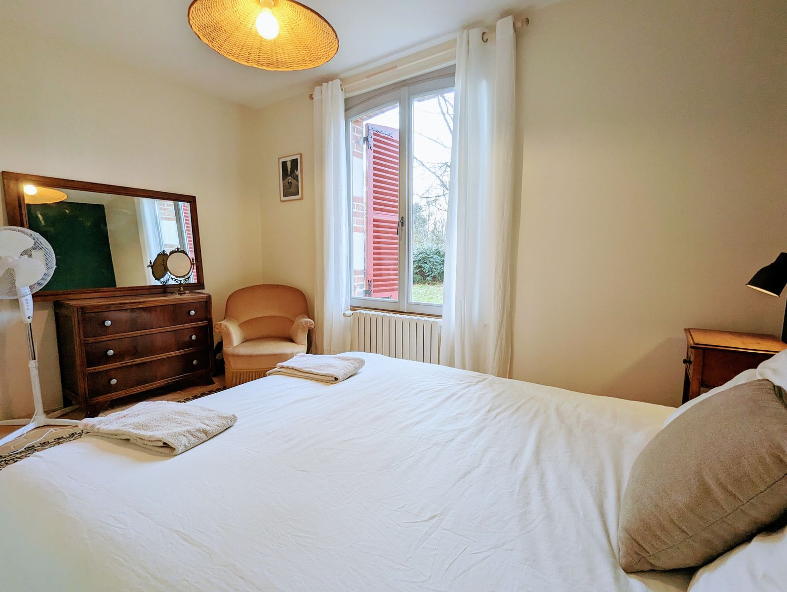 Accessible par un escalier extérieur : chambre avec lit 2 personnes (160 x 200 cm) et deux lits une personne (80 x 190 cm) pouvant être rapprochés pour former un lit 2 personnes grâce à un surmatelas, wc séparés et salle d'eau.