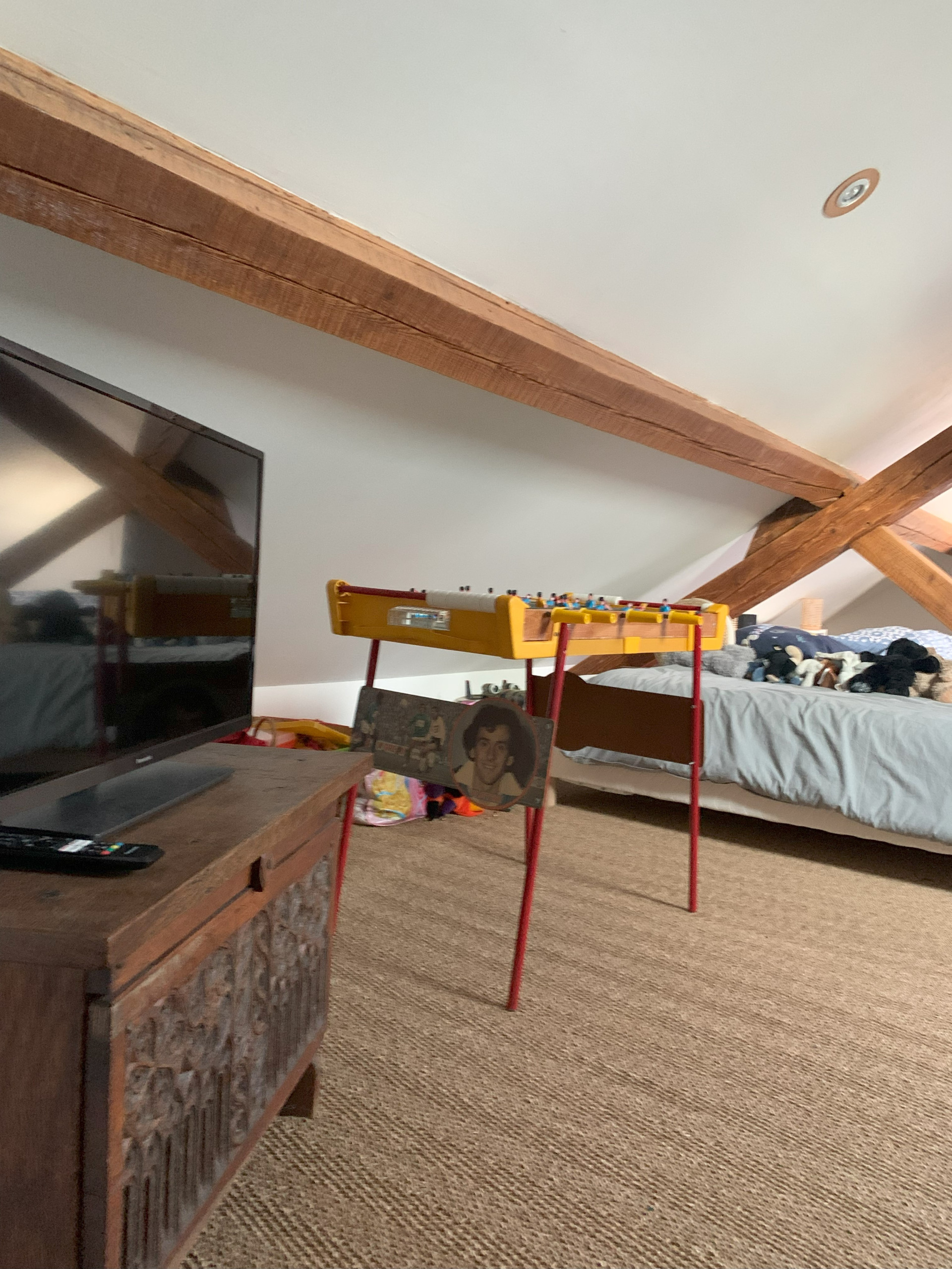 Le dernier étage est dédié aux plus jeunes, avec une sélection de jouets pour stimuler leur imagination. Pour les tout-petits, un lit parapluie et une chaise haute sont à disposition, facilitant le séjour des familles avec des enfants en bas âge.