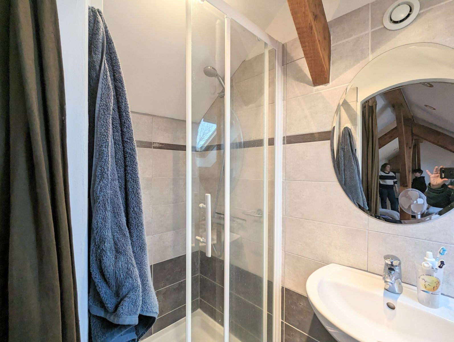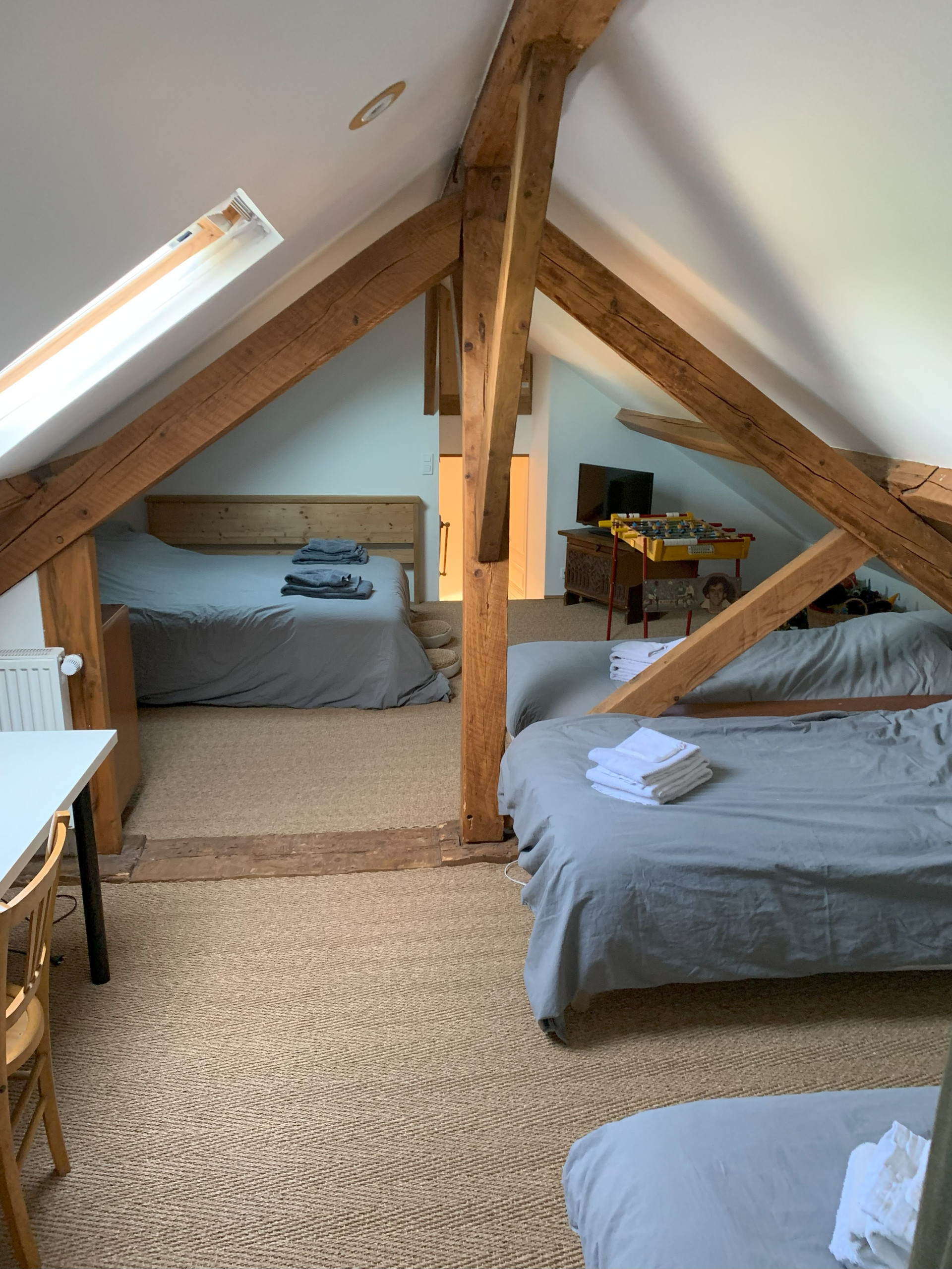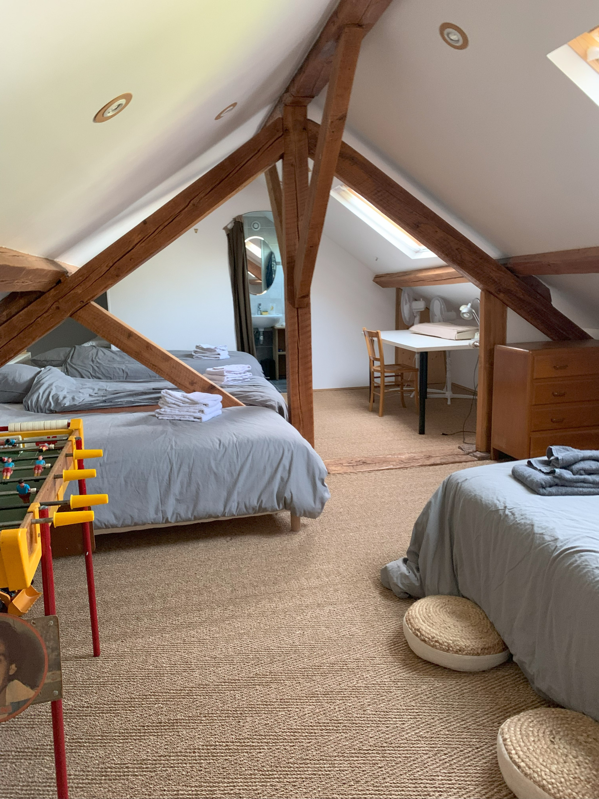 Au deuxième étage : dortoir avec lit 2 personnes (160 x 200 cm), 2 lits une personne (90 x 190 cm), télévision, babyfoot et salle d'eau avec lavabo, douche et wc.