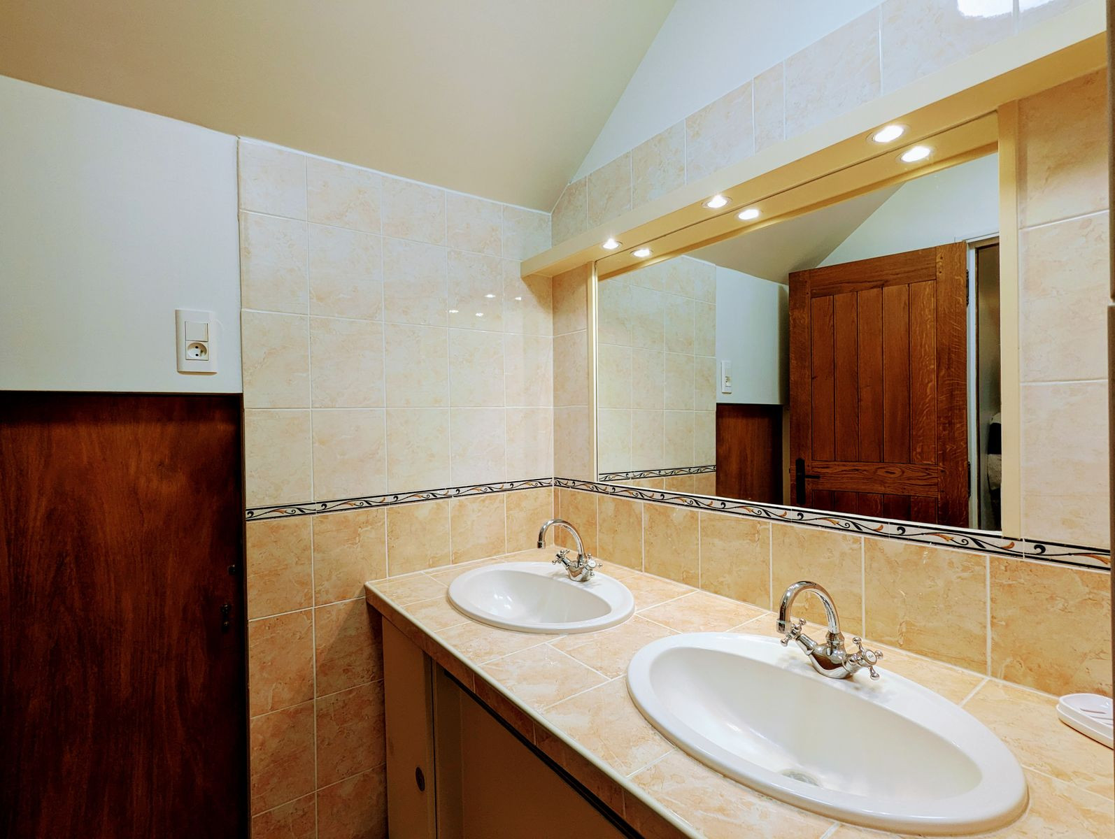 Au premier étage : chambre avec lit 2 personnes (160 x 200 cm) et chambre avec lit 2 personnes (160 x 200 cm) et lit 1 personne (90 x 190 cm), salle d'eau avec douche, lavabos et wc.