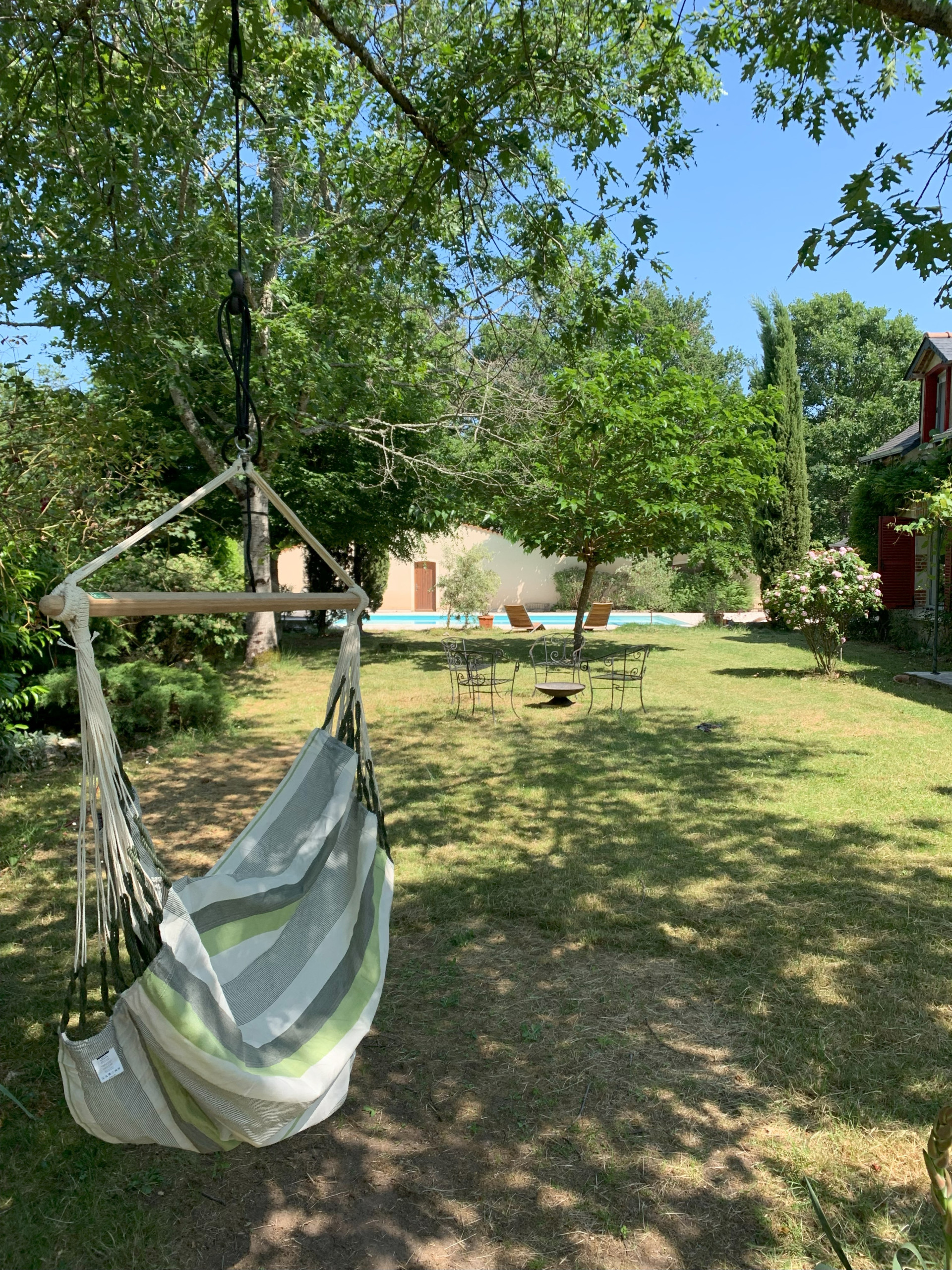 Venez vous détendre dans notre vaste terrain clôturé et arboré, parfait pour les moments de repos en pleine nature. Entre mai et septembre, profitez d'un hamac pour des moments de relaxation totale. La terrasse ombragée est idéale pour partager des repas en famille ou entre amis, dans un cadre paisible.