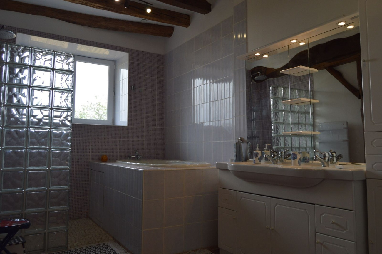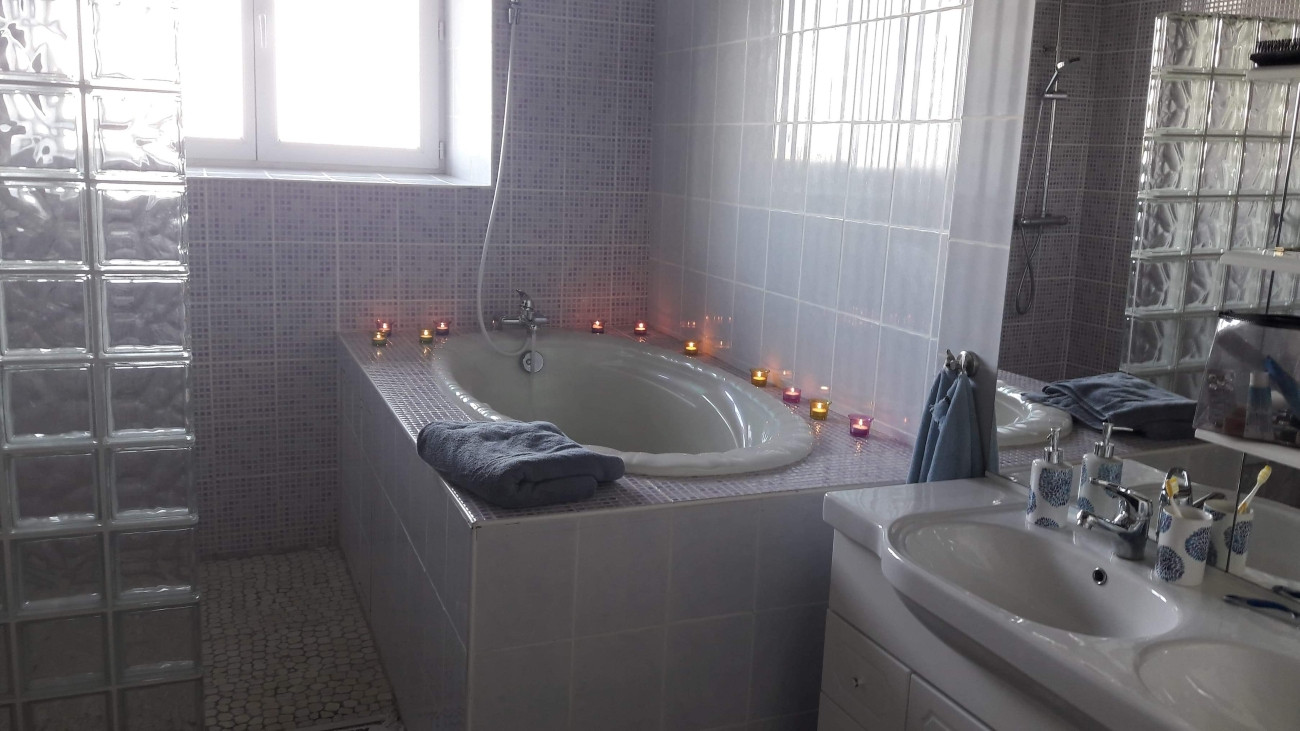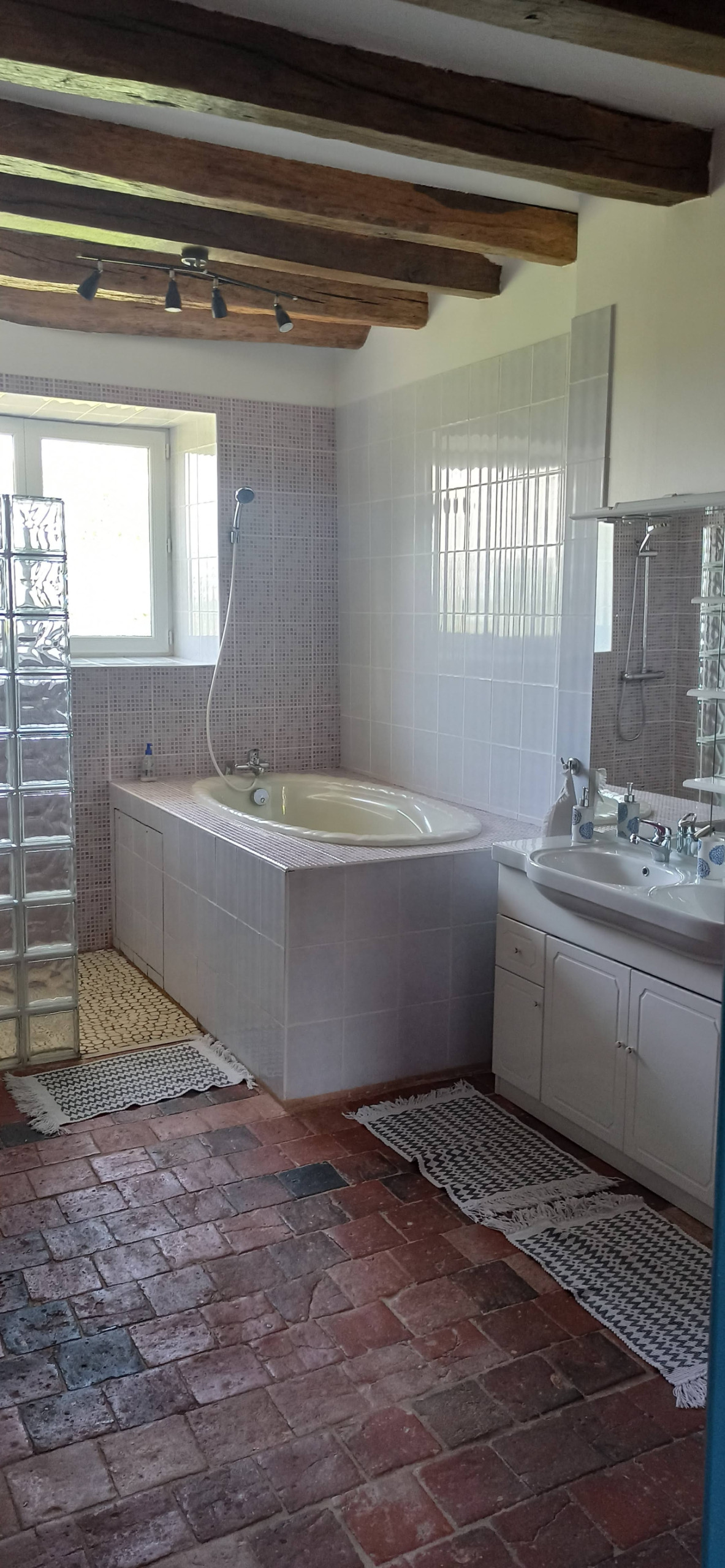 Dotée de 2 salles de bain: une à l'etage avec douche et WC et une au rez de chaussée avec baignoire, douche et WC