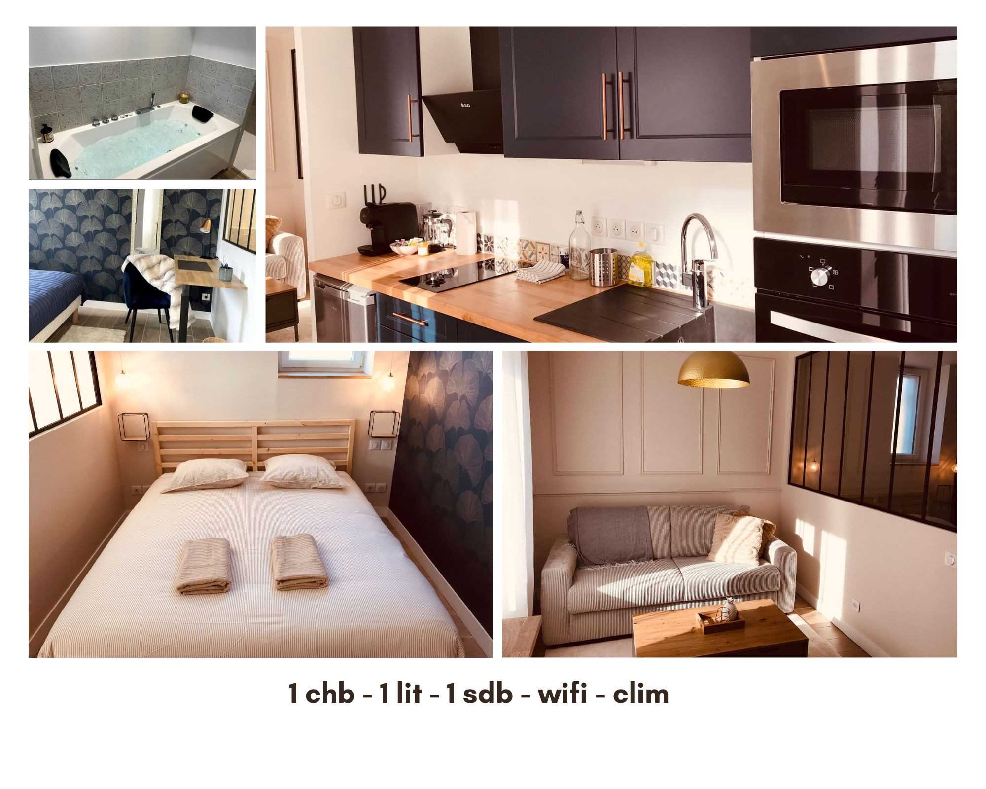 La salle de bain comprend une baignoire blanéo, offrant un moment de détente après une journée de travail ou de visite. Une climatisation et une pompe à chaleur garantissent un environnement à température idéale quelle que soit la saison.