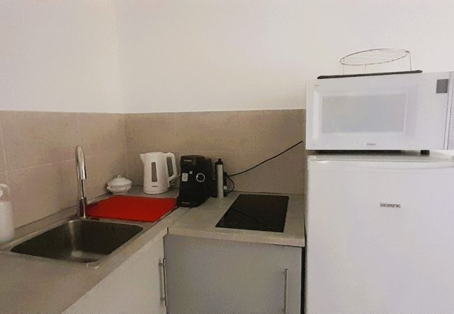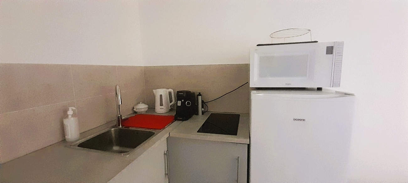 La cuisine est équipée pour préparer vos repas. Vous y trouverez un réfrigérateur, un micro-ondes, une cafetière, une bouilloire, une plaque de cuisson ainsi que la vaisselle et les couverts nécessaires. Une machine à laver est également à votre disposition pour faciliter vos séjours prolongés.